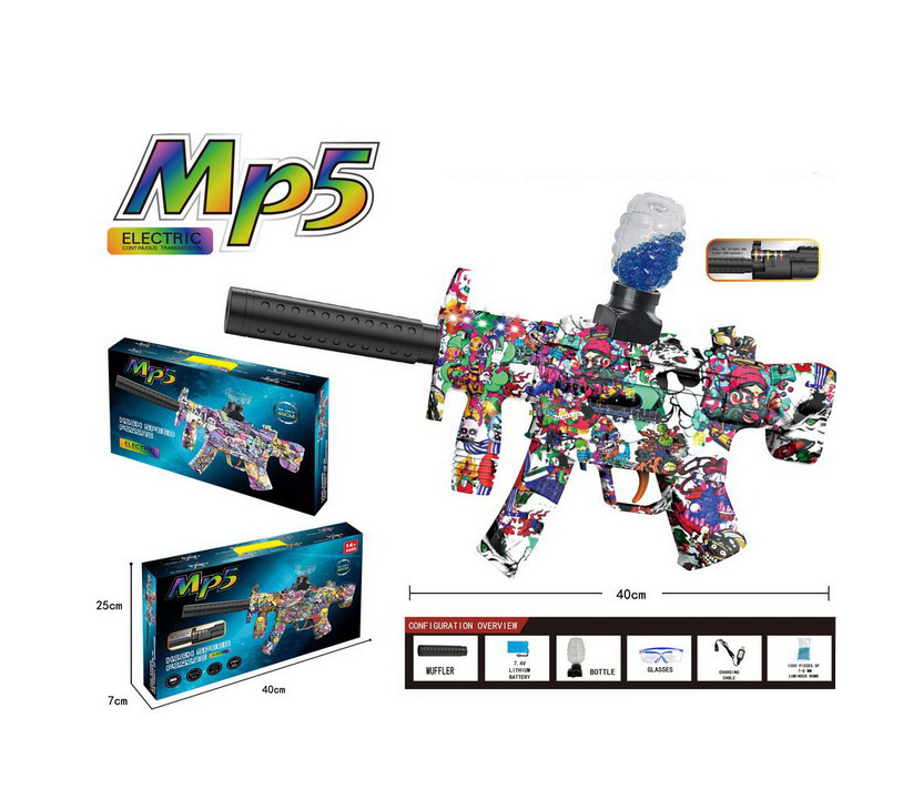 Pistolul Blaster Electric MP5 cu bile de gel este o jucărie de acțiune vândută en-gros, concepută pentru jocuri dinamice, rapide și captivante, dedicate copiilor pasionați de simulări tactice și aventură. Modelul este inspirat din designul clasic MP5, având un aspect modern, colorat, cu imprimeu grafic atractiv, care îl face ușor de recunoscut și extrem de atractiv la raft.