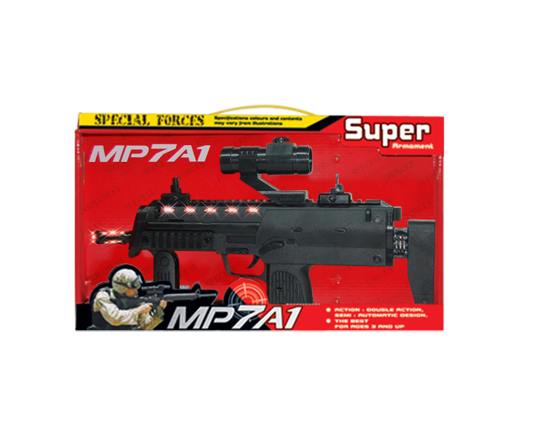Construită din plastic rezistent, cu finisaj negru mat și elemente tactice vizibile, jucăria MP7A1 Super este dotată cu efecte luminoase integrate pe partea frontală și laterală, care se activează în timpul utilizării. Luminile oferă un impact vizual puternic și sporesc realismul jocului, atrăgând imediat atenția copiilor. Designul compact, cu mâner ergonomic și pat rabatabil, permite o manevrare ușoară chiar și pentru mâini mai mici.