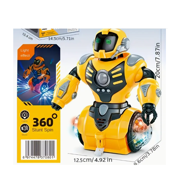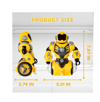 Robotul are o înălțime de aproximativ 20 cm, dimensiunea perfectă pentru a fi observat cu ușurință în timp ce se deplasează pe suprafețe plane. Analizând detaliile vizuale, acesta este echipat cu un sistem complex de lumini LED multicolore amplasate pe brațe și în zona ochilor, care creează un efect vizual spectaculos, mai ales în încăperile cu lumină scăzută. În timpul mișcărilor rotative, robotul redă melodii ritmate, transformând orice spațiu într-o mică discotecă robotizată. Fabricat din plastic ABS durabil și rezistent la șocuri, robotul este conceput să reziste la utilizare intensă, fiind o alegere excelentă pentru copiii pasionați de tehnologie și aventuri spațiale.