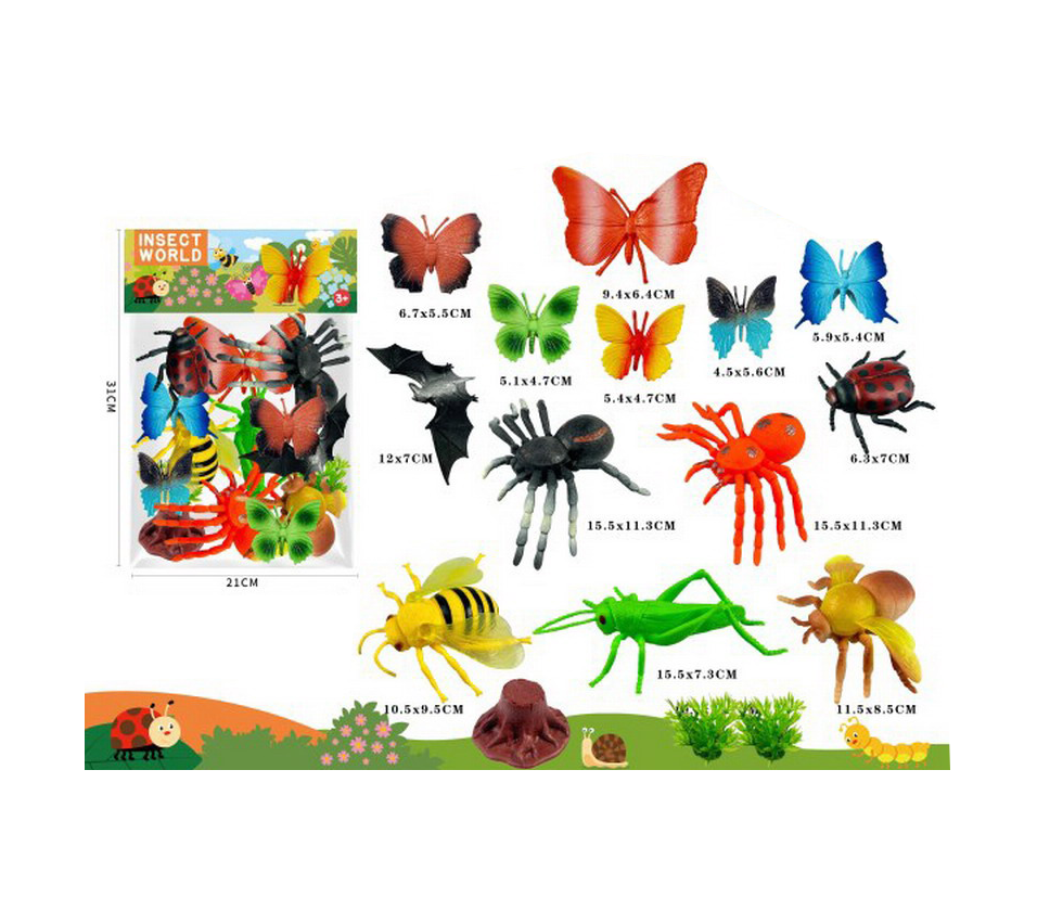 Setul include piese cu dimensiuni variate, pornind de la 5 cm și ajungând până la 12 cm lungime pentru exemplarele mai mari. Analizând pozele produsului, se observă prezența unor insecte emblematice: fluturi colorați, călugărițe, scorpioni, albine, furnici gigant și diverse specii de gândaci. Aceste figurine sunt fabricate dintr-un material plastic rezistent, ușor flexibil, ceea ce le face ideale pentru a fi utilizate în diorame școlare, experimente în grădină sau jocuri de rol pline de aventură. Este setul perfect pentru a-i ajuta pe copii să depășească frica de insecte și să învețe despre importanța acestora în ecosistem, totul prin intermediul unei activități captivante.