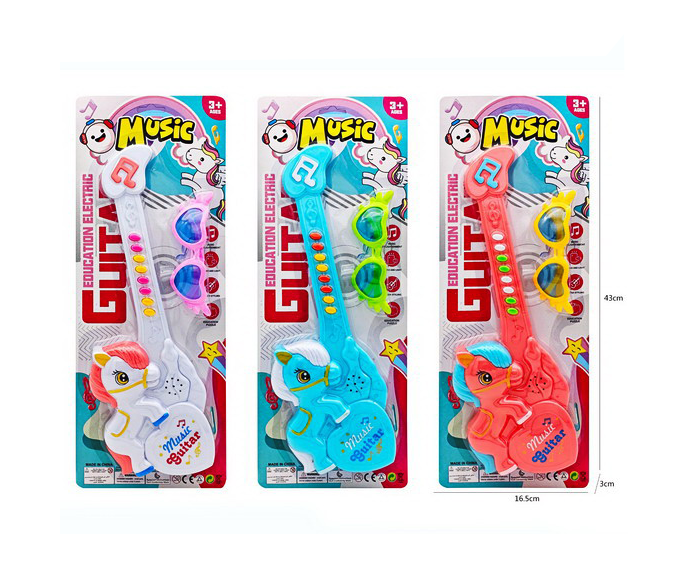 - Set Complet: Include o chitară de jucărie și o pereche de ochelari asortați cu tematică unicorn.
