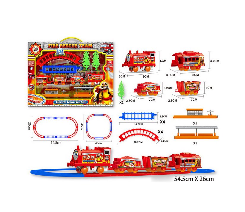 Locomotiva are un design modern și este însoțită de 3 vagoane specializate: un vagon cu scară mobilă, un vagon cisternă pentru apă și un vagon de transport echipamente. Analizând componentele setului, șinele incluse permit asamblarea unui traseu circular sau oval cu un diametru/lungime de aproximativ 75 cm, oferind spațiu suficient pentru manevre sigure. Locomotiva este dotată cu un mecanism de rulare fluid și detalii grafice specifice unităților de pompieri. Fabricat din plastic durabil, setul este ușor de asamblat prin sistemul de îmbinare rapidă a șinelor, fiind o jucărie stabilă și distractivă care poate fi extinsă cu alte elemente din aceeași gamă.