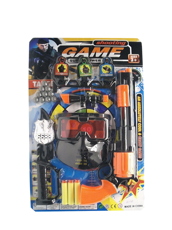 Pistolul inclus are o lungime de aproximativ 25 cm și este echipat cu un mecanism de tragere precis. Analizând componentele setului, acesta vine însoțit de proiectile fabricate dintr-o spumă moale (soft foam), special concepute pentru a fi inofensive la impact, permițând utilizarea setului atât în interior, cât și în exterior. Masca inclusă are un design futurist, este prevăzută cu vizieră și orificii pentru respirație, fiind dotată cu o baretă elastică ajustabilă pentru a se potrivi confortabil pe chipul copiilor. Fabricat din plastic ABS rezistent, acest set „Shooting Game” încurajează mișcarea fizică, dezvoltarea coordonării mână-ochi și spiritul de fair-play în timpul jocurilor de grup.