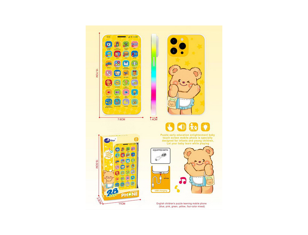 Pentru partenerii noștri en-gros, acest model reprezintă o evoluție tehnologică în categoria jucăriilor pentru bebeluși, eliminând necesitatea schimbării constante a bateriilor datorită funcției de reîncărcare prin USB. Suprafața frontală imită un touchscreen real, unde fiecare pictogramă declanșează reacții diferite: numere, culori, sunete de animale, melodii vesele și efecte sonore specifice apelurilor telefonice. Marginile telefonului sunt dotate cu lumini LED multicolore care pulsează în ritmul sunetelor, captând imediat atenția micuțului explorator.
