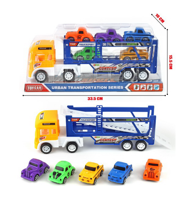 - Set Complet 6-în-1: Include un tir transportor mare și 5 mașinuțe variate.