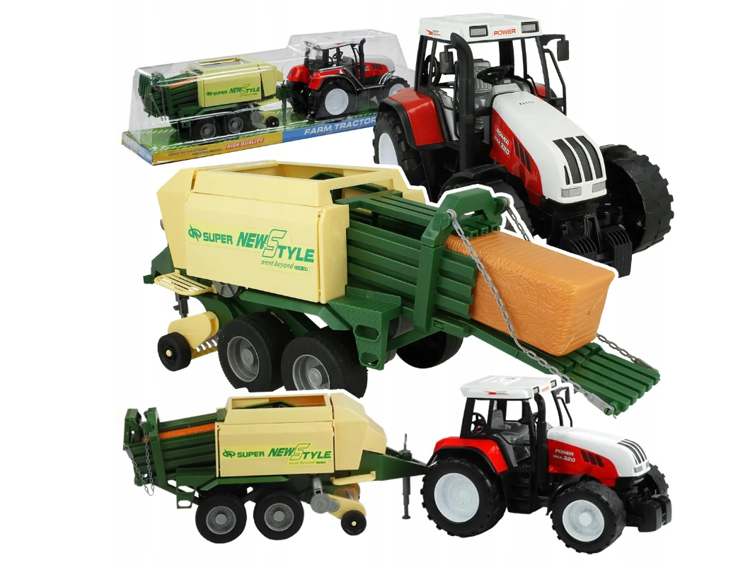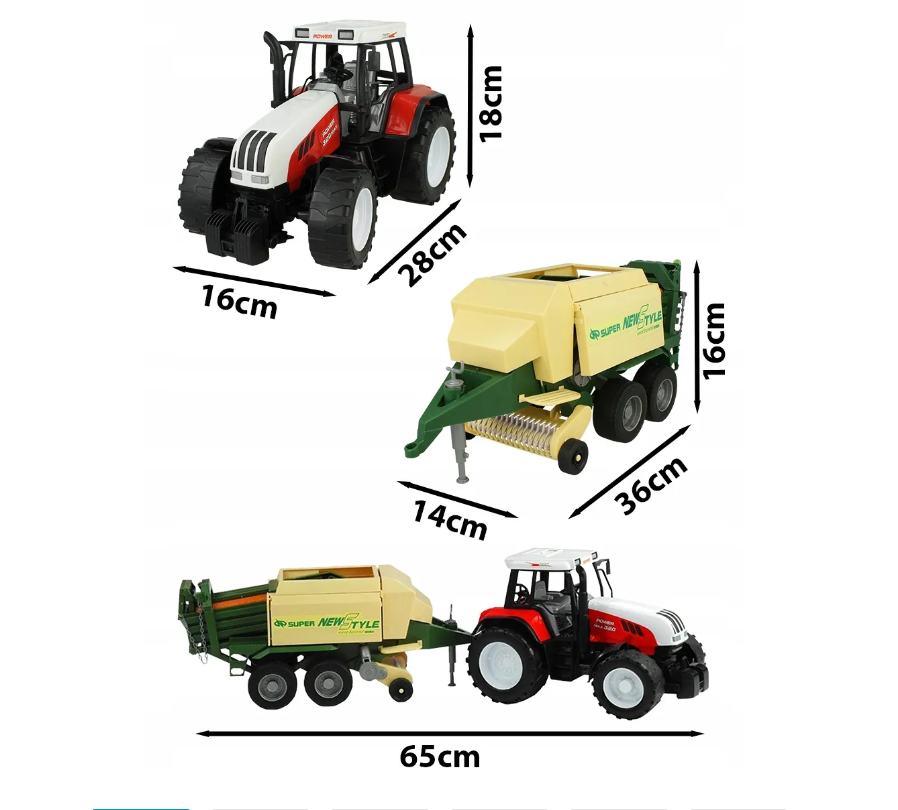 Pentru partenerii noștri en-gros, acest model este extrem de apreciat datorită funcțiilor mecanice. Balotiera nu este doar o simplă remorcă; aceasta dispune de elemente mobile care simulează procesul de presare și evacuare a balotului. Tractorul este echipat cu un sistem de cuplare standard, permițând atașarea și detașarea rapidă a remorcii, oferind astfel multiple posibilități de joacă.