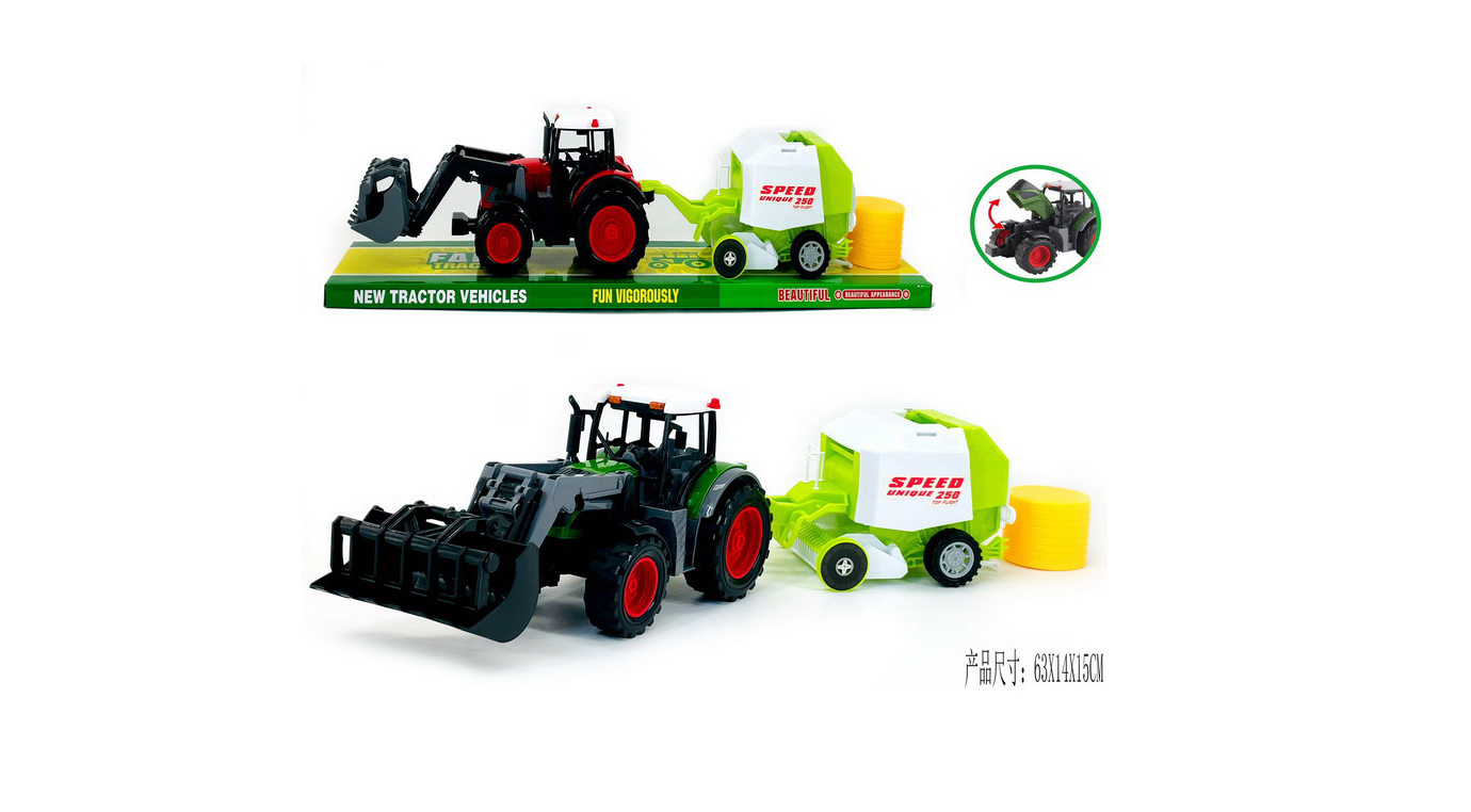 Pentru partenerii noștri en-gros, acest model se remarcă prin prezența sa vizuală impunătoare la raft. Setul este format dintr-un tractor robust și o presă de balotat detașabilă, echipată cu mecanisme care imită funcționarea utilajului real. Copiii pot cupla și decupla presa, pot deschide capacul posterior al acesteia și pot învăța prin joacă cum sunt formați baloții pe câmp. Tractorul dispune de roți mari, cu profil adânc, perfecte pentru „deplasarea” pe terenuri accidentate (covor, iarbă sau nisip).