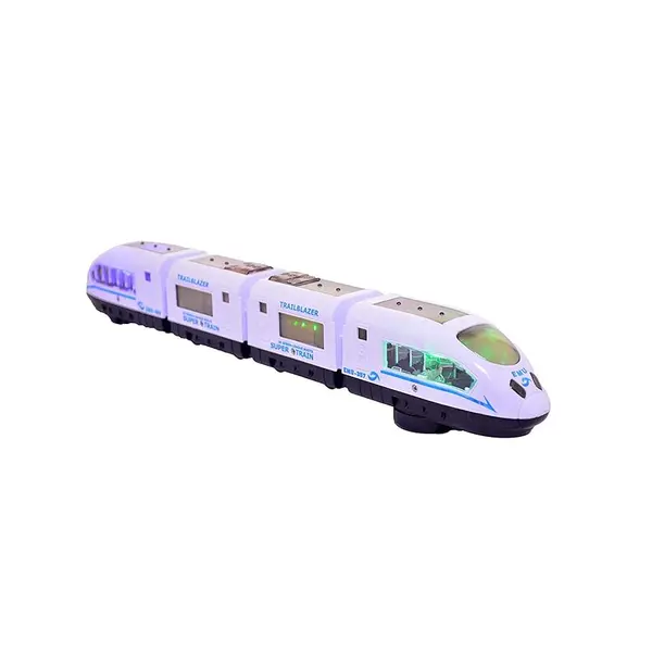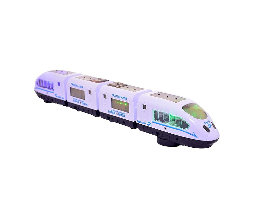 Modelul este conceput sub forma unui tren tip „săgeată” sau „bullet train”, cu o caroserie alungită, aerodinamică și ferestre transparente. Lungimea totală a trenului este de aproximativ 43 cm, oferind un impact vizual puternic și o prezență clară în timpul jocului. Designul modern, în culori deschise, este completat de iluminare LED integrată, care se activează în timpul funcționării și adaugă un plus de dinamism jocului.