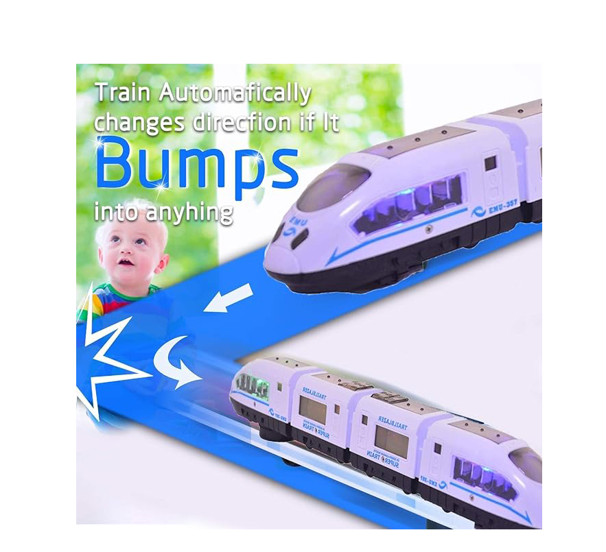 Un element distinctiv al acestui tren electric este funcția de schimbare automată a direcției. Din imaginile produsului reiese că trenul este dotat cu un sistem inteligent care detectează obstacolele și își schimbă direcția de deplasare în momentul în care intră în contact cu acestea. Această funcție oferă o experiență de joacă continuă, fără a fi necesară intervenția constantă a copilului, făcând produsul ideal și pentru copiii mai mici.