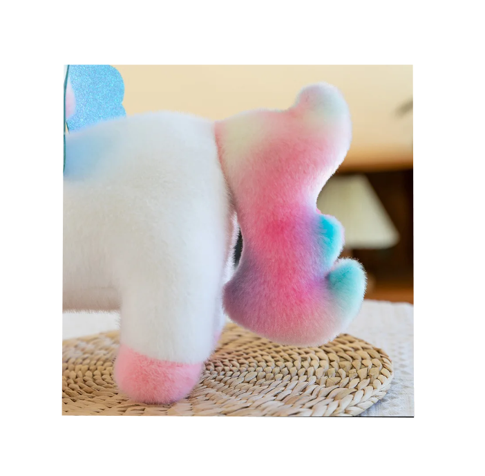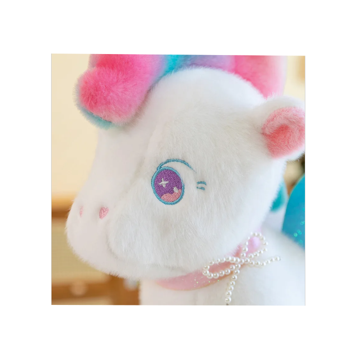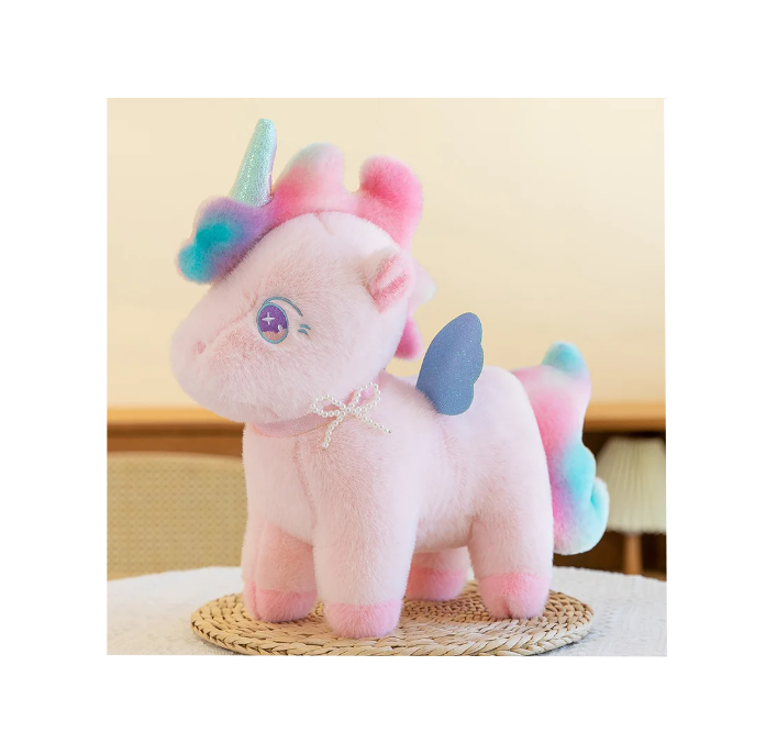 Fabricat integral din pluș fin și plăcut la atingere, unicornul oferă o senzație confortabilă și sigură, fiind potrivit pentru manipulare zilnică. Corpul este stabil, cu picioare scurte și proporții echilibrate, iar aripile decorative adaugă un plus de farmec vizual fără a afecta rezistența produsului. Coama și coada sunt realizate în nuanțe degradé, atent cusute, oferind un aspect premium pentru categoria sa de preț.