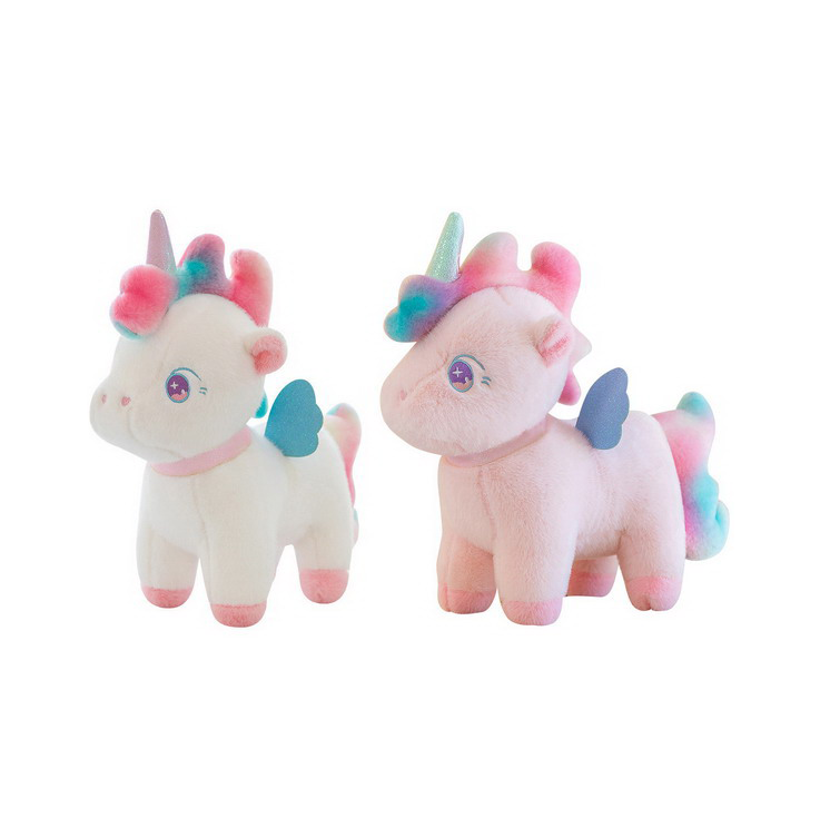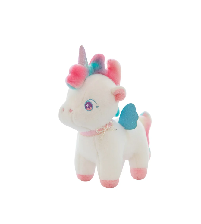 Unicornul cu aripi din pluș multicolor este o jucărie decorativă și de joacă, realizată din material plușat moale, destinată comercializării en-gros către magazine de jucării, gift shop-uri, florării, librării și comercianți specializați în produse pentru copii. Designul său pastelat, cu accente roz, bleu și alb, transformă acest produs într-o alegere ideală pentru vitrine atractive și pachete cadou dedicate celor mici.