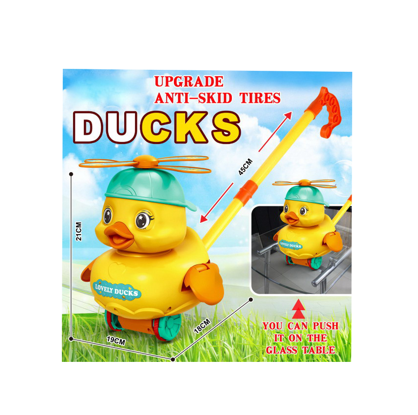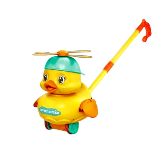 Designul jucăriei este unul extrem de captivant: în timp ce este împinsă, rața își rotește elicea poziționată pe șapcă, creând un efect vizual dinamic care îi va fascina pe copii. Mai mult, mecanismul intern produce un sunet ritmic de tip „păcănit” la fiecare rotație a roților, oferind un feedback auditiv care încurajează deplasarea continuă. Analizând detaliile vizuale, jucăria se remarcă prin culorile vibrante (corp galben, șapcă roșie și detalii albastre), elemente care stimulează recunoașterea cromatică și coordonarea mână-ochi. Mânerul ergonomic este ajustat pentru statura copiilor de vârstă mică, transformând această rață în partenerul ideal de plimbare, disponibil acum pentru vânzare angro la un preț competitiv.