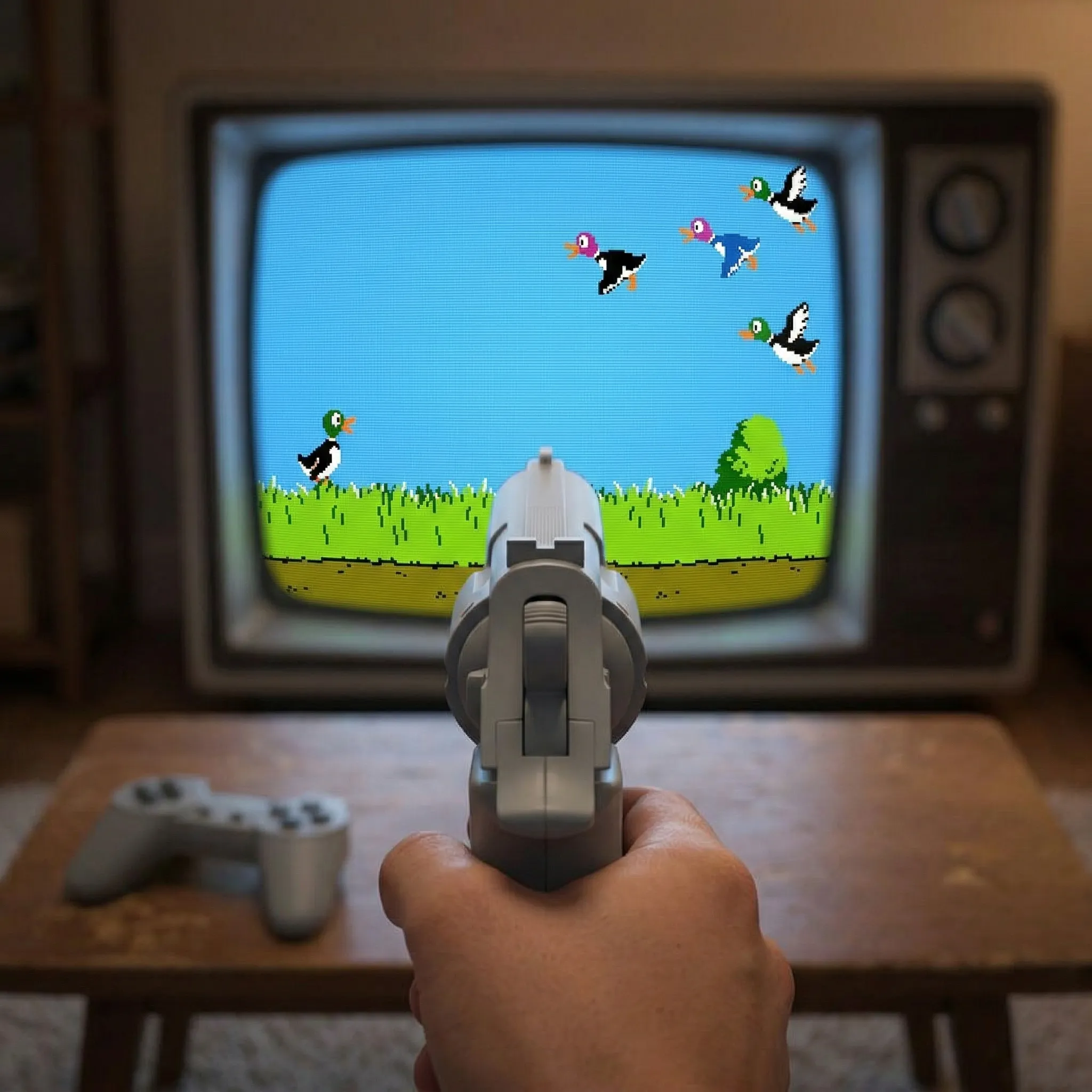 - Pistol Interactiv Inclus: Setul include un pistol special pentru jocurile de tir (precum faimosul Duck Hunt). Această funcție adaugă un nivel de interactivitate și distracție pe care jocurile moderne tind să îl ignore, oferind satisfacția țintirii directe pe ecran.