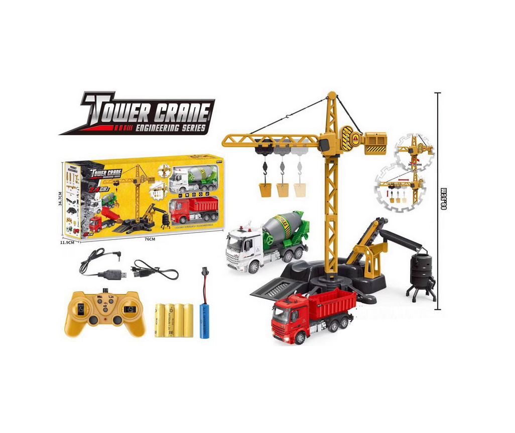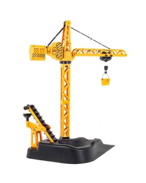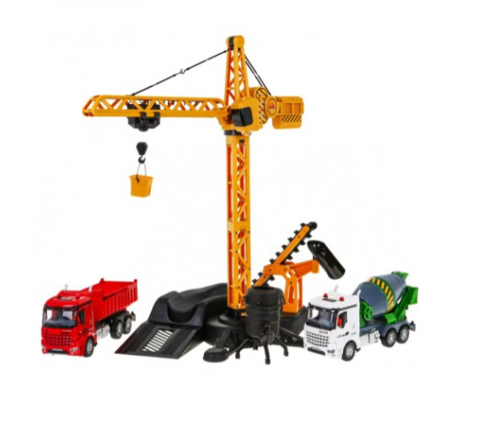 - Set 3 în 1: Include o macară turn, o betonieră și un camion de tip dumper.