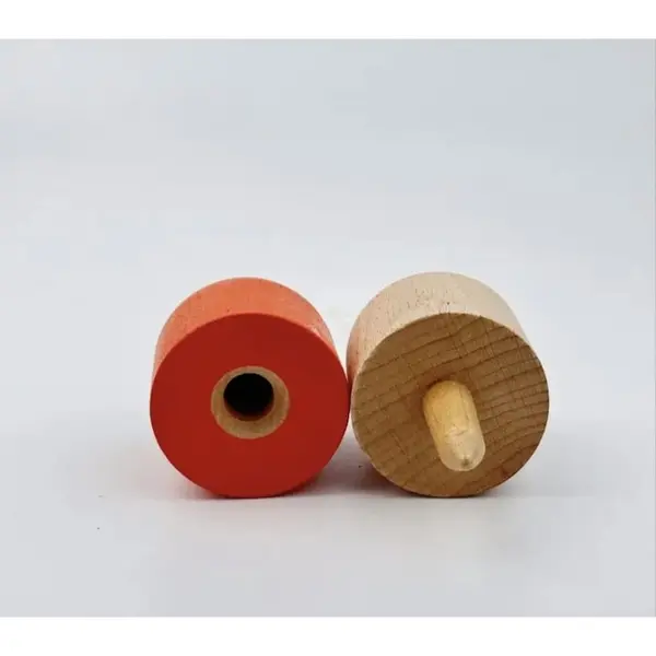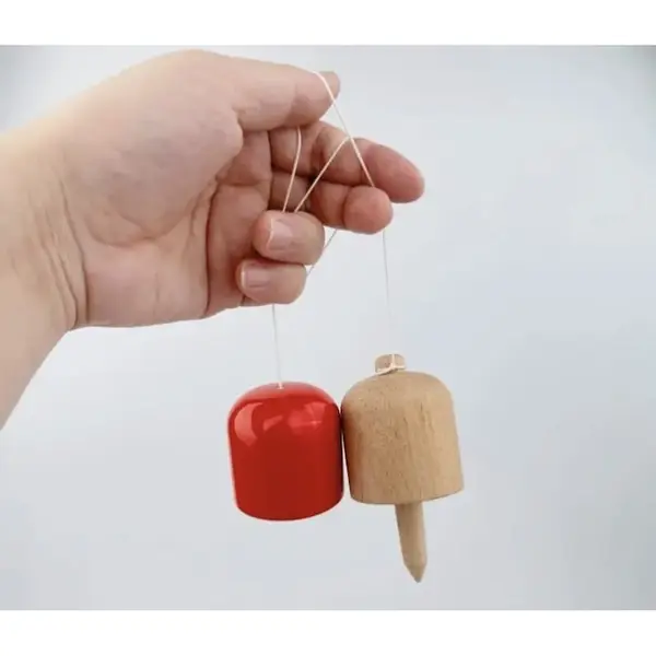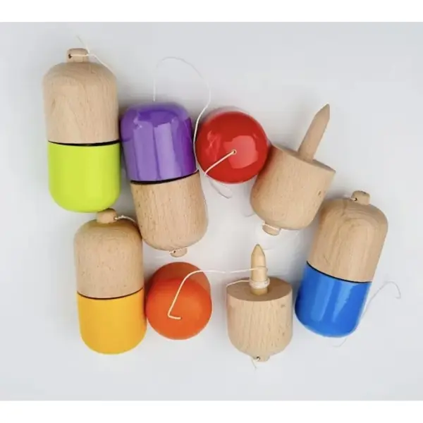 Construcția jucăriei este realizată integral din lemn de calitate superioară, finisat cu atenție pentru a asigura o aderență perfectă în timpul execuției trucurilor. Jucăria este compusă din două părți principale unite printr-o sfoară rezistentă: baza (ken) și capacul. Designul ergonomic permite o prindere sigură și confortabilă, facilitând învățarea rapidă a mișcărilor de bază pentru începători, oferind în același timp provocări tehnice avansate pentru utilizatorii experimentați. Fiecare piesă este vopsită în culori vibrante și contrastante, vizibile în imaginile produsului, ceea ce nu doar îmbunătățește estetica, ci ajută și la urmărirea mișcării în aer pentru o precizie sporită.