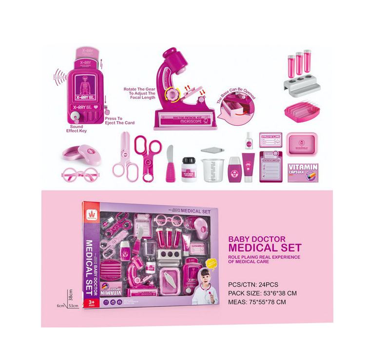 Din imaginile produsului se observă o gamă largă de instrumente medicale de jucărie: stetoscop, microscop, aparat de raze X cu efecte sonore, ochelari, seringă, foarfecă, flacoane pentru medicamente, cutii de vitamine, tăvițe și alte accesorii specifice unei truse medicale. Aceste elemente permit copiilor să creeze scenarii variate de joc, simulând consultații, investigații și tratamente.