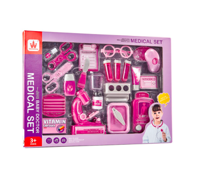 Trusa este prezentată într-un ambalaj tip cutie transparentă, care permite vizualizarea tuturor accesoriilor incluse. Designul în nuanțe de roz, combinat cu elemente grafice medicale, este adaptat preferințelor copiilor și creează un produs ușor de remarcat la raft. Setul conține 37 de piese, toate realizate din plastic, concepute special pentru joacă sigură.