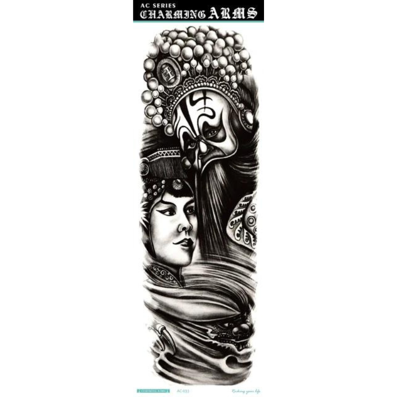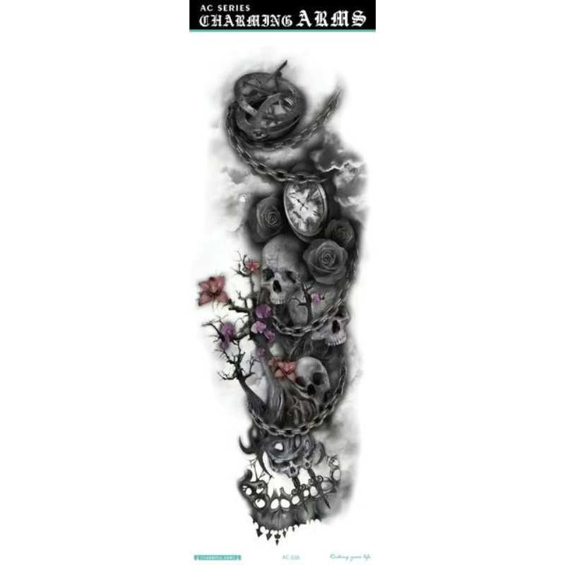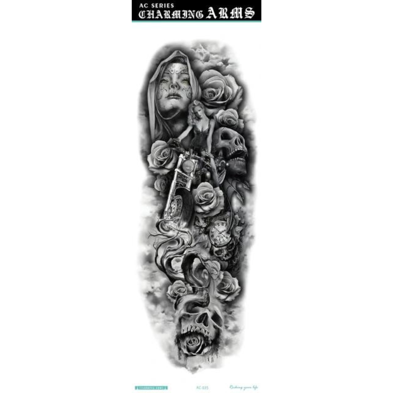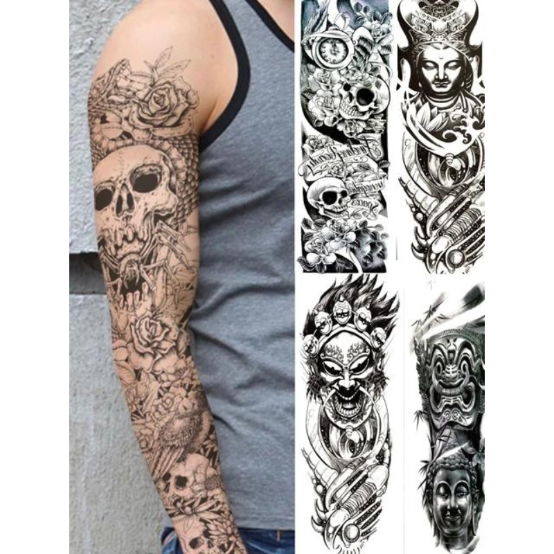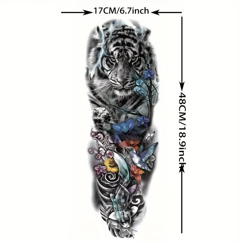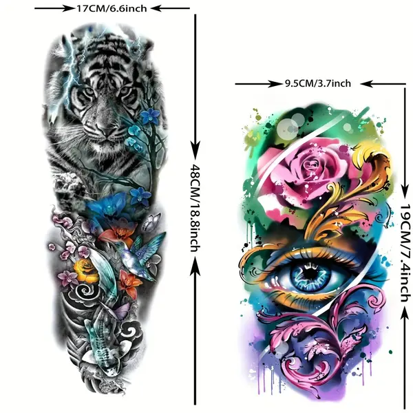 Obțineți un look spectaculos și impunător cu ajutorul acestor tatuaje temporare pentru braț, special concepute pentru a acoperi zone extinse. Cu dimensiuni generoase de 48 x 17 cm, acest tatuaj de tip manșetă (full arm) este ideal pentru a îmbrăca întreg brațul sau piciorul, oferind un aspect ultra-realist, comparabil cu cel al unui tatuaj permanent realizat în salon. Modelele sunt complexe și bogate în detalii, de la compoziții mecanice și geometrice, până la motive cu animale mistice sau elemente tribale.