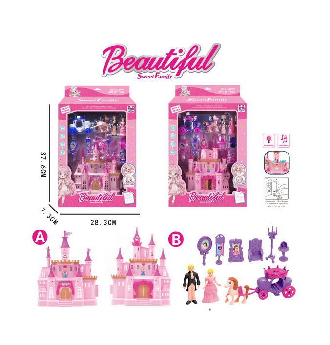 Pentru partenerii comerciali care caută articole de succes în segmentul jucării fete, acest castel este disponibil pentru achiziție en-gros, reprezentând un produs cu o prezentare vizuală de impact. Setul include nu doar structura castelului, ci și o familie regală completă ("Sweet Family"), oferind toate personajele necesare pentru scenarii complexe de joacă. Castelul dispune de funcții electronice captivante: la apăsarea butonului principal, acesta emite melodii magice și efecte de lumini LED care iluminează turnurile, creând o atmosferă de sărbătoare în regat.
