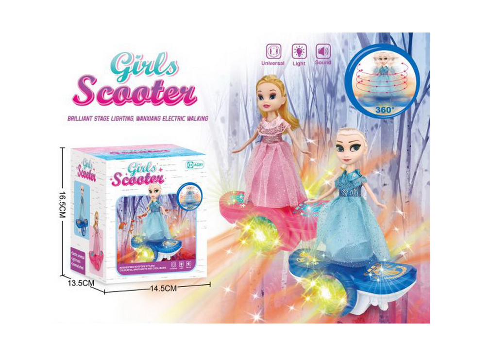 Pentru partenerii noștri en-gros, acest model reprezintă o alegere strategică pentru diversificarea stocului, fiind o alternativă activă la păpușile statice. Skateboard-ul este piesa centrală a divertismentului, fiind echipat cu lumini LED multicolore care proiectează efecte vizuale pe podea și un modul sonor care redă melodii ritmate. Această combinație de stimuli vizuali și auditivi captează atenția copiilor, încurajându-i să se miște și să interacționeze cu jucăria.
