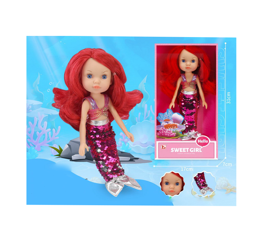 Păpușa are o înălțime de aproximativ 30 cm, fiind dotată cu o coadă articulată care îi permite să „înoate” prin aer în timpul jocului sau să stea așezată pe marginea recifului imaginar. Analizând detaliile din imagini, păpușa are un păr lung și mătăsos, în nuanțe pastelate, perfect pentru a fi coafat cu ajutorul periei incluse în set. Accesoriile, precum diadema regală și bijuteriile marine, subliniază statutul său de prințesă a oceanelor. Fabricată din plastic durabil și materiale textile de calitate, această sirenă este gata pentru ore întregi de joacă, stimulând imaginația și dezvoltarea motricității fine prin manipularea accesoriilor.