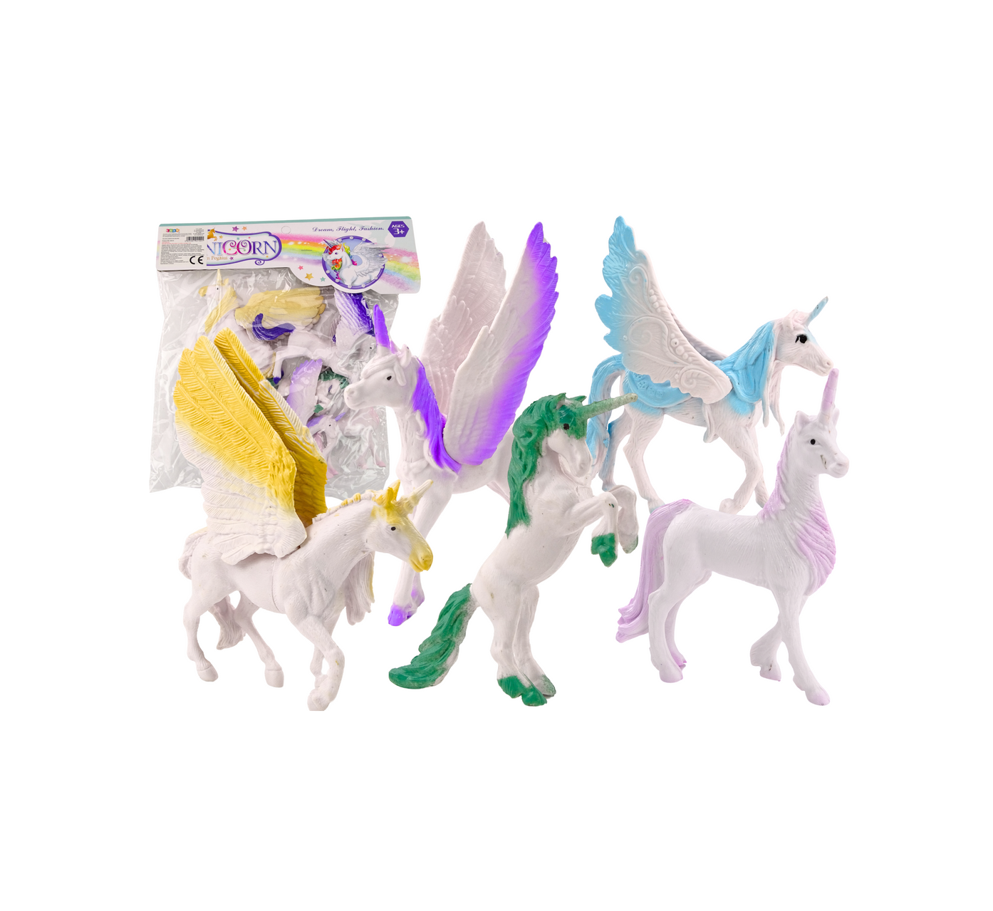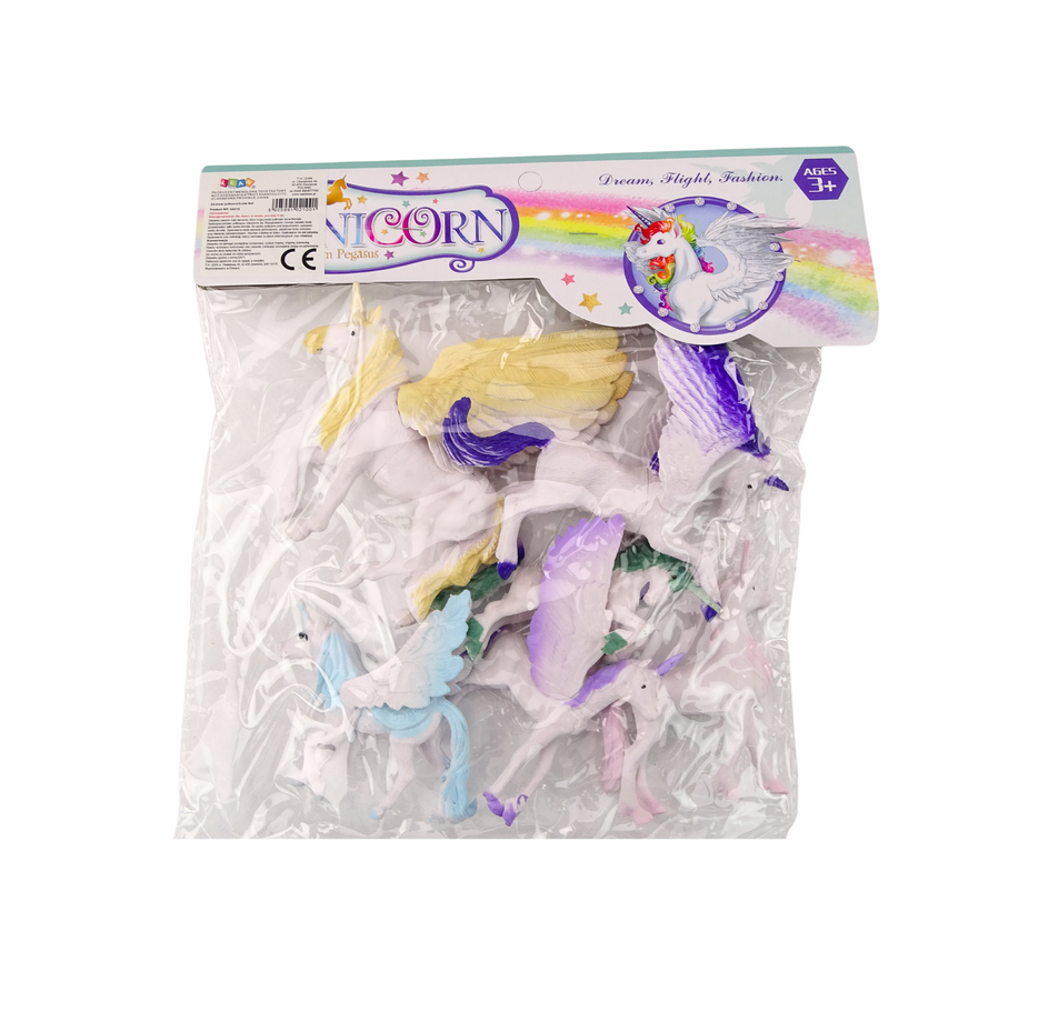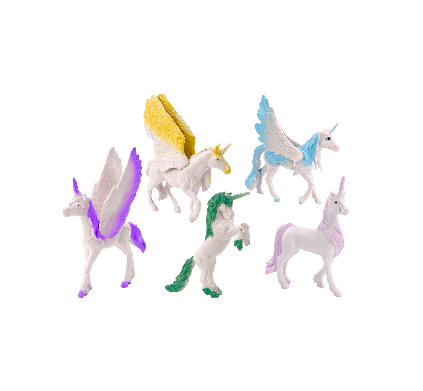 - Set Tematic: Include 6 figurine diferite cu design de unicorn și cal înaripat (Pegasus).
