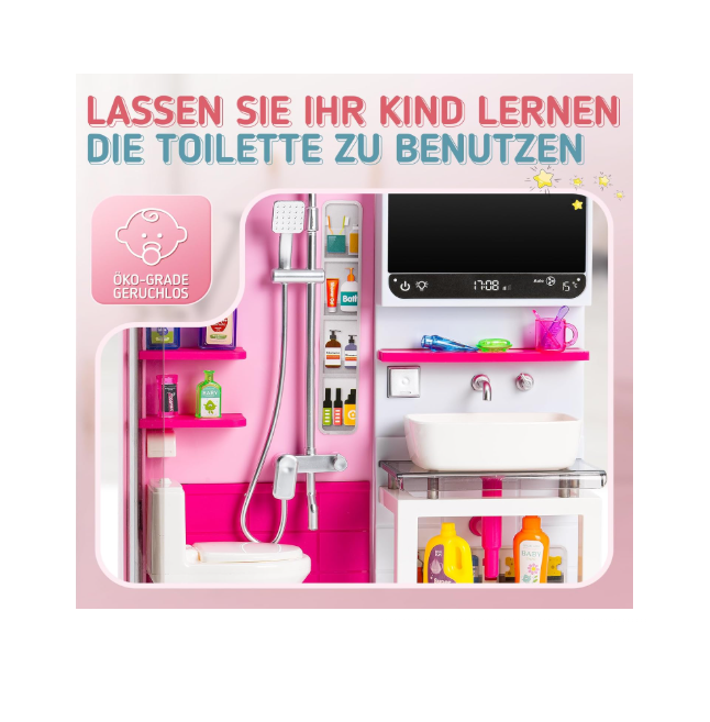Transformă ritualul de îngrijire într-o experiență magică cu acest Set de Baie pentru Păpuși, o jucărie concepută pentru a aduce un plus de realism și distracție în jocurile de rol. Setul este piesa centrală perfectă pentru orice casă de păpuși, oferind o replică detaliată a unei băi moderne, decorată în nuanțe vesele de roz și albastru pastel. Elementul spectaculos al acestui set este cada interactivă, care dispune de funcții electronice captivante ce vor încânta orice fetiță.