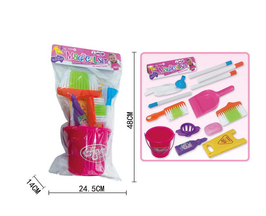 Pentru partenerii noștri en-gros, seturile de curățenie reprezintă articole de bază în categoria jocurilor de rol, fiind extrem de căutate pentru grădinițe sau pentru uz casnic. Piesa centrală a setului este găleata cu storcător, însoțită de un mop cu franjuri textile sau burete și o mătură cu peri moi. Toate componentele sunt fabricate din plastic de înaltă densitate, ușor și rezistent la apă, garantând o durată lungă de utilizare chiar și în condiții de joacă intensă.
