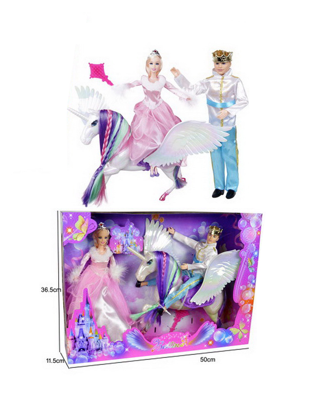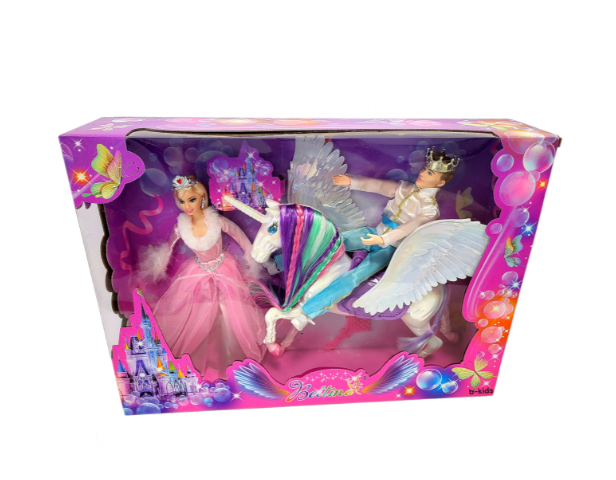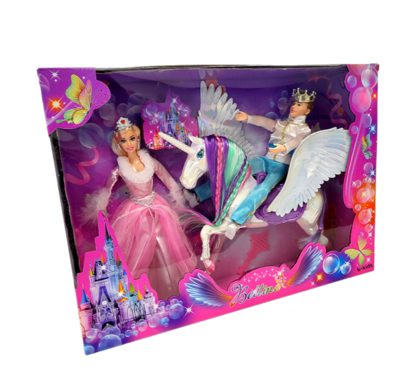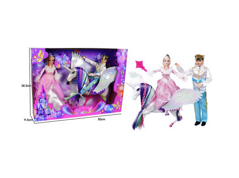 Păpușa prințesă are o înălțime de 30 cm și poartă o rochie de bal spectaculoasă, cu detalii strălucitoare. Partenerul său, prințul, este echipat în haine regale, fiind gata pentru marea ceremonie. Piesa centrală a setului este calul unicorn, o creatură fantastică cu un corn argintiu și o coamă lungă, mătăsoasă, care poate fi pieptănată cu accesoriile incluse. Analizând detaliile din imagini, se observă că unicornul are o șa decorată, permițând uneia dintre păpuși să „călărească” spre castelul imaginar. Realizat din materiale sigure și durabile, acest set este cadoul ideal pentru fetițele care iubesc universul magic și jocurile de rol complexe.