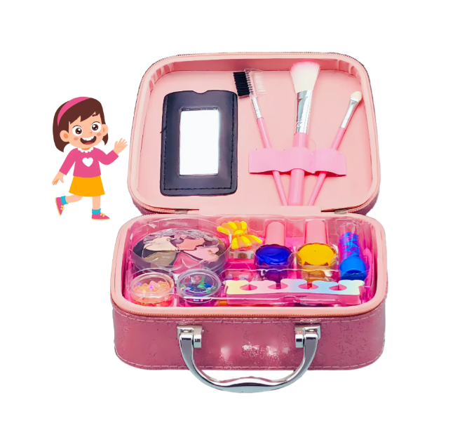 În interior, trusa conține multiple accesorii cosmetice de jucărie, atent aranjate în compartimente dedicate. Conform imaginilor, setul include o oglindă, pensule de machiaj, recipiente cu farduri colorate, accesorii decorative și alte elemente specifice jocului de rol cosmetic. Toate piesele sunt realizate din plastic și materiale ușoare, adaptate utilizării de către copii.