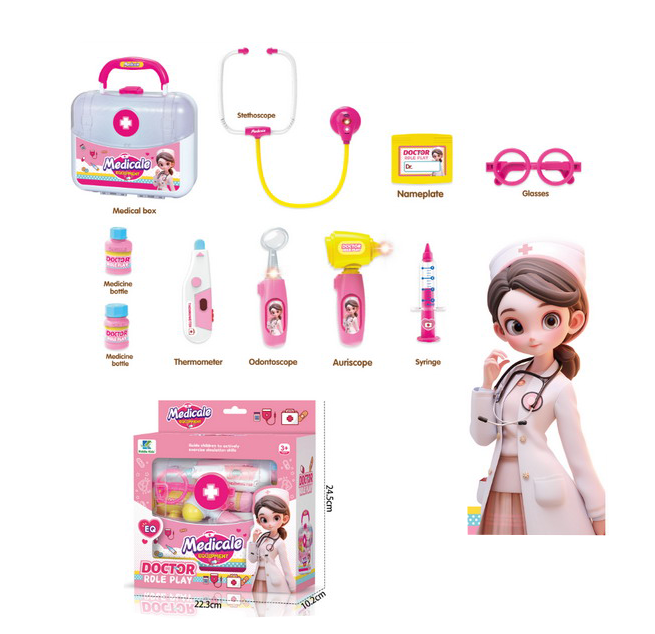 Conform imaginilor, trusa include o gamă variată de instrumente medicale de jucărie, precum: stetoscop, seringă, termometru, otoscop, otoscop auricular, sticlă pentru medicamente, etichetă de doctor, ochelari, precum și alte accesorii tematice. Toate piesele sunt realizate din plastic, cu margini rotunjite, fiind adaptate utilizării de către copii.