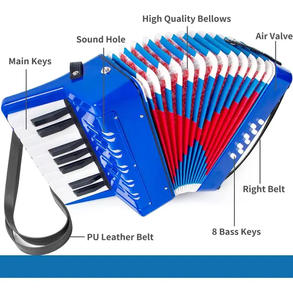 Pentru partenerii noștri care activează în segmentul jucăriilor și instrumentelor muzicale engros, varianta pe albastru este extrem de populară, fiind adesea prima alegere pentru cadouri destinate băieților sau pentru dotarea sălilor de grupă din grădinițe. Este un produs care se vinde excelent pe tot parcursul anului, reprezentând un echilibru ideal între o jucărie interactivă și un instrument de studiu incipient. Alegând acest acordeon pentru oferta dumneavoastră de vânzare angro, investiți într-un produs care aduce valoare educativă reală și zâmbete garantate pe chipurile micilor muzicieni.