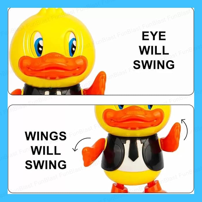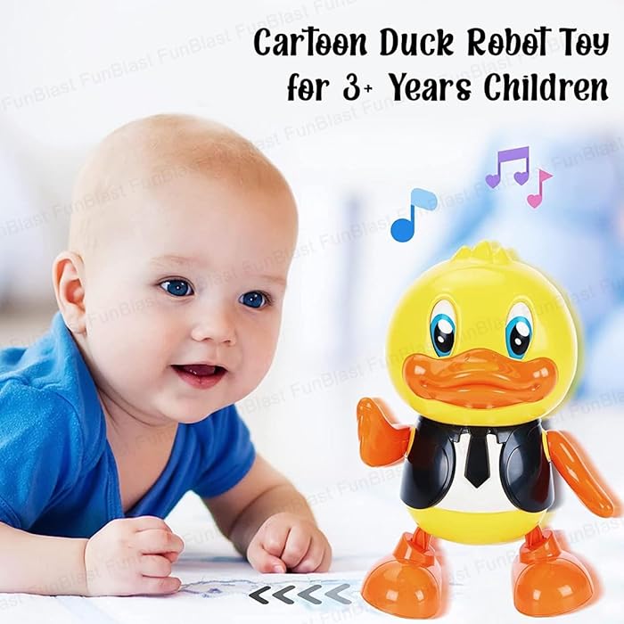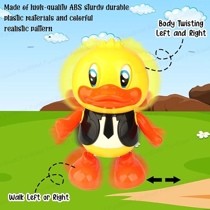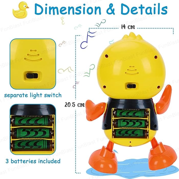 Rața are o înălțime de aproximativ 20 cm, fiind ușor de manevrat de mânuțele mici. Analizând funcțiile sale, jucăria dispune de un sistem complex de iluminare LED situat în brațe și în zona capului, care proiectează culori vibrante în timp ce se deplasează stânga-dreapta. Muzica ritmată și sunetele vesele completează experiența senzorială, stimulând auzul și vederea. Fabricată din plastic ABS de înaltă calitate, non-toxic și rezistent la căzături, rața dansatoare este proiectată cu margini rotunjite pentru o siguranță maximă în timpul utilizării. Este cadoul perfect pentru a stimula curiozitatea și buna dispoziție a celor mici.
