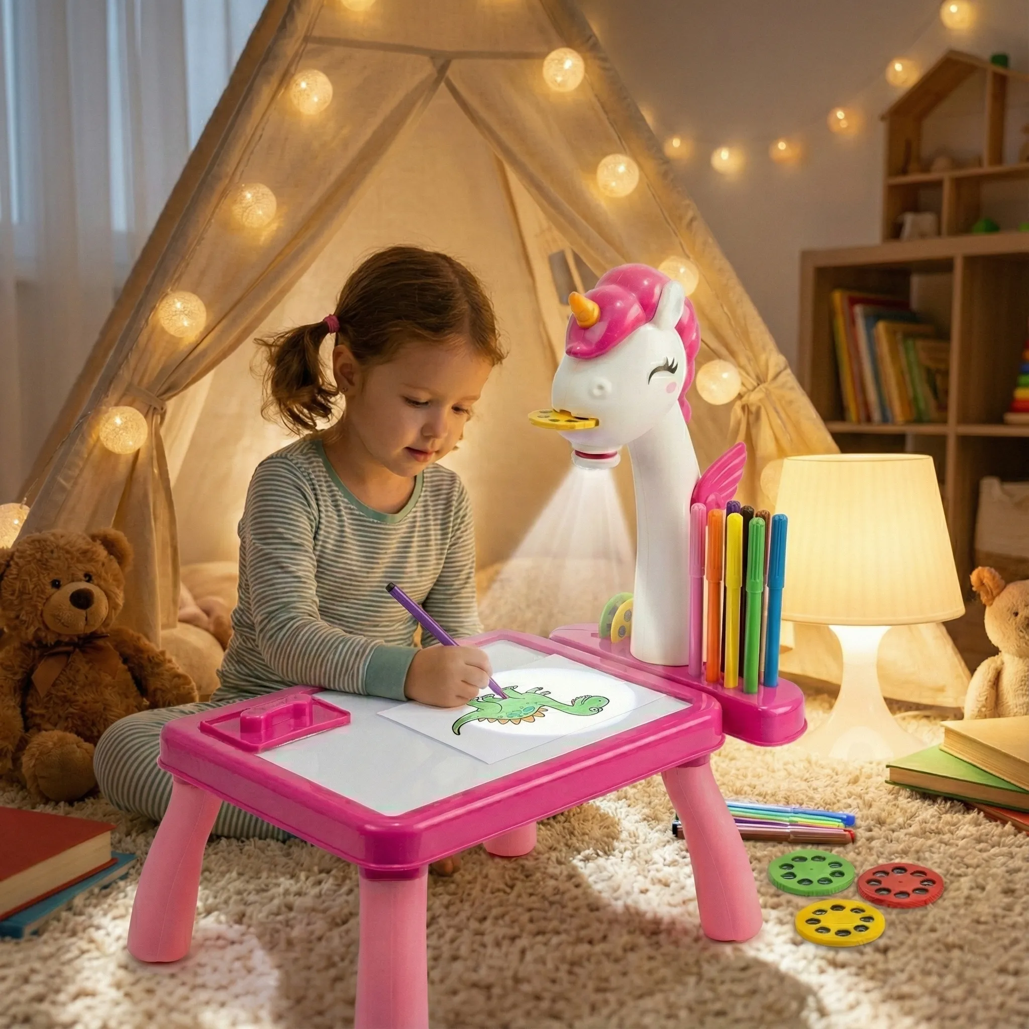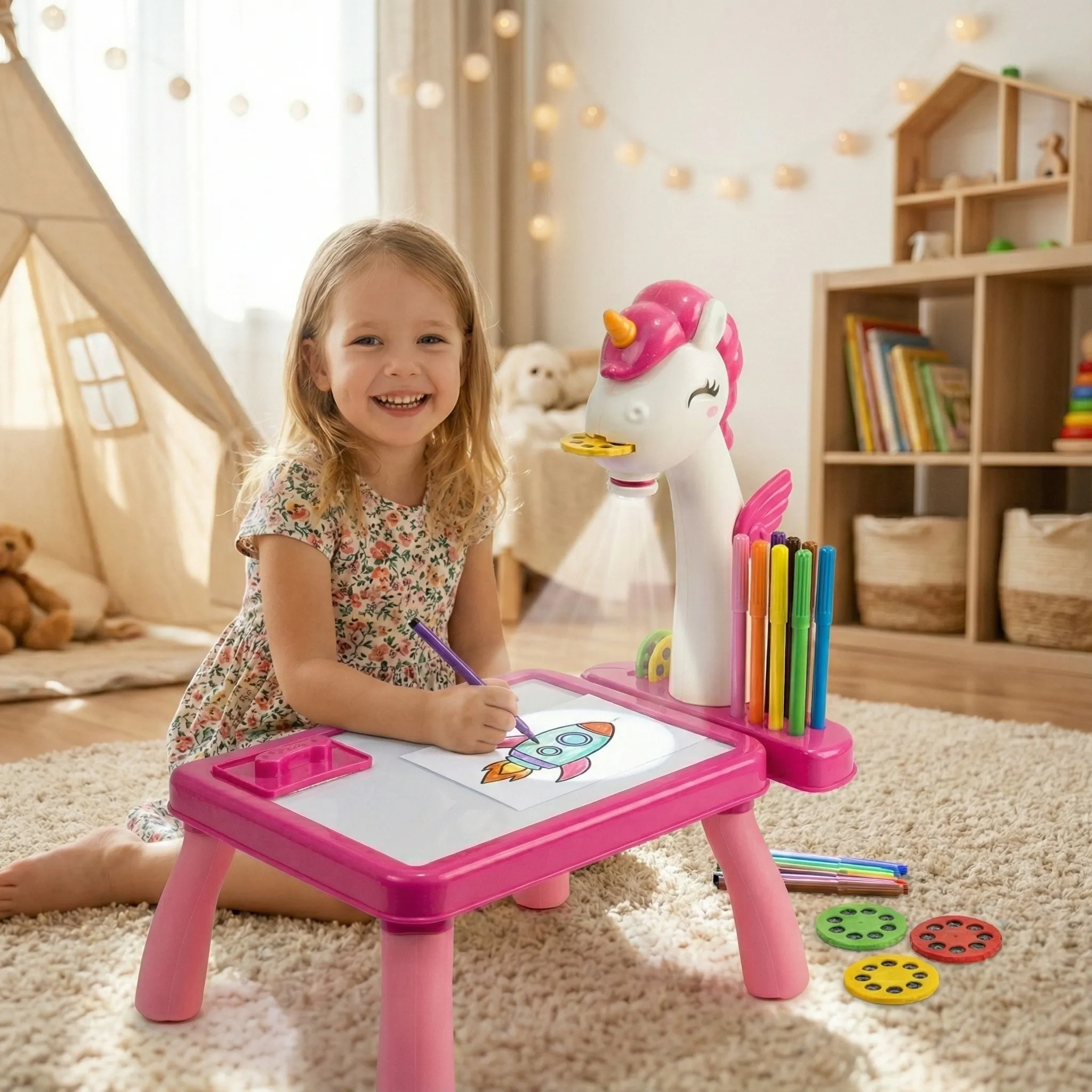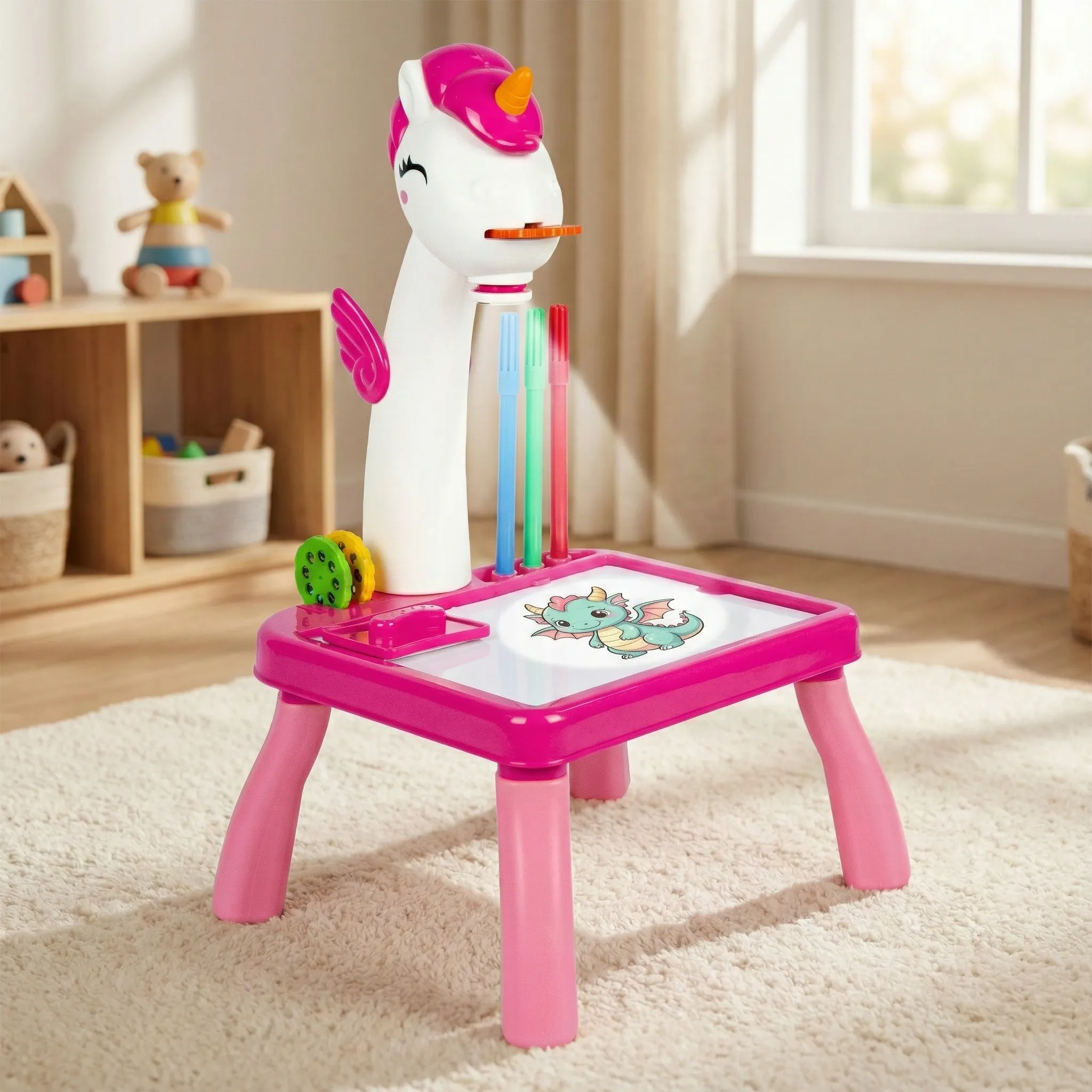 Funcționarea este magică și simplă: introduci unul dintre discurile cu șabloane, aprinzi proiectorul, iar imaginea clară este proiectată pe măsuța de lucru. Copilul trebuie doar să urmărească conturul proiectat cu ajutorul celor 12 markere incluse, dezvoltându-și astfel coordonarea ochi-mână și precizia. Este un mod fantastic de a construi încrederea în sine a copilului, care va fi mândru de desenele perfecte realizate chiar de el.