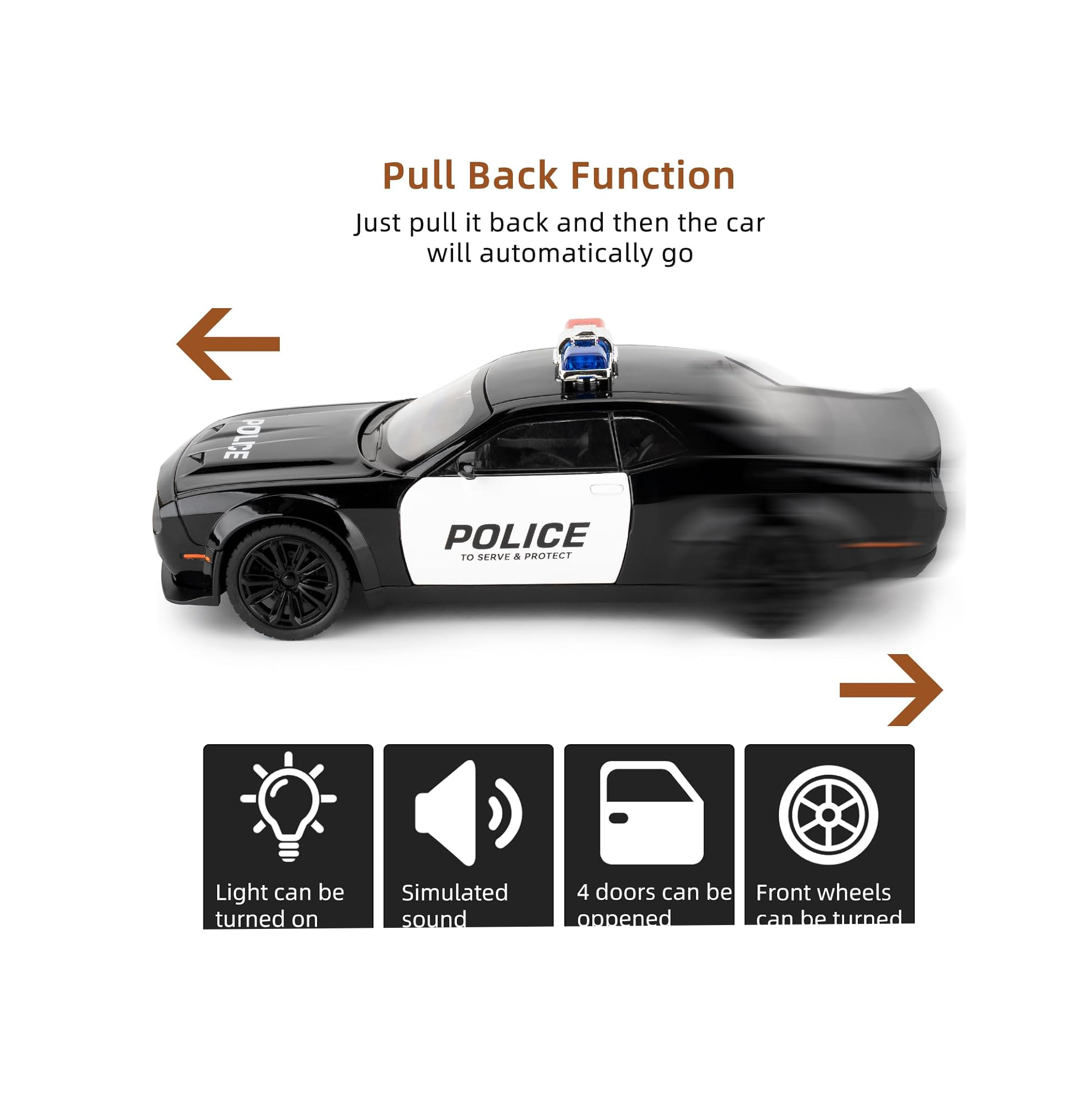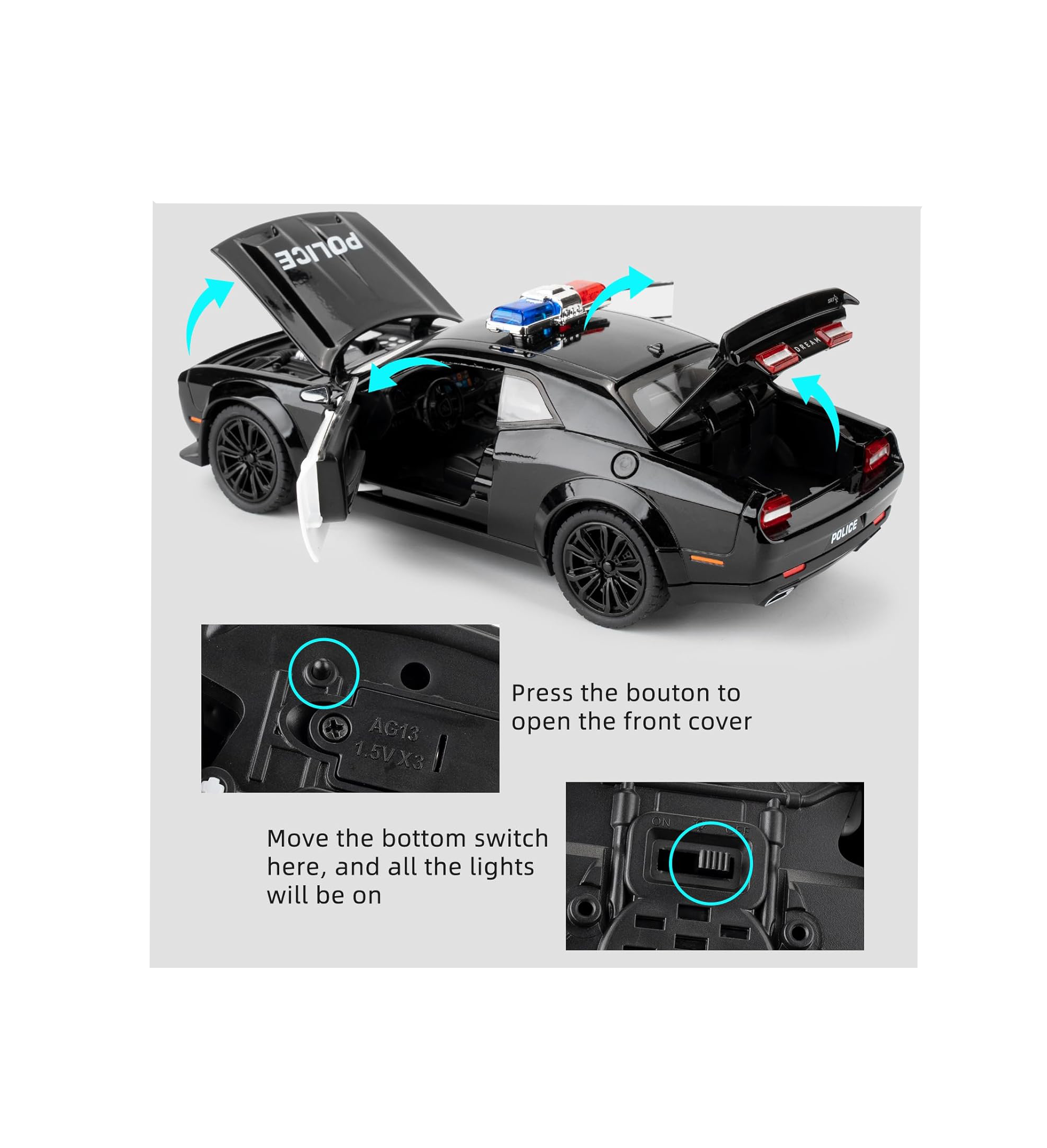 Mașina metalică de Poliție cu sunete și lumini este o jucărie realistă, concepută pentru vânzare en-gros, ideală pentru importatori, distribuitori și comercianți care doresc produse atractive, bine finisate și cu valoare mare de joc pentru copii. Modelul este realizat la scară 1:22, cu un design inspirat din autospecialele moderne de poliție, oferind un nivel ridicat de detaliu și funcționalitate.