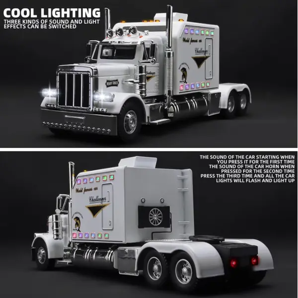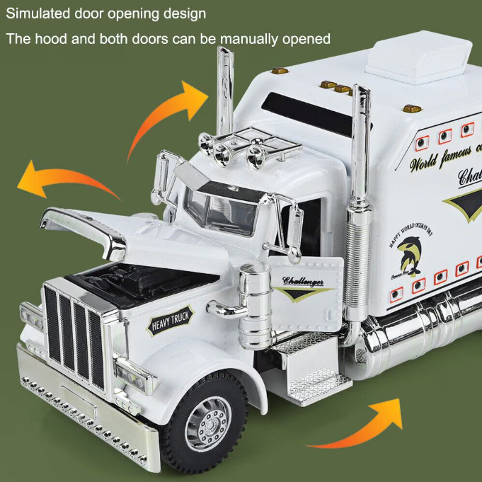 Pătrunde în universul gigantilor șoselelor americane cu această machetă metalică TIR Peterbilt, o replică spectaculoasă a celebrului camion ce a definit transportul pe distanțe lungi în Statele Unite. Cu o lungime impresionantă de 24 cm, acest model nu este doar o simplă jucărie, ci o piesă de colecție veritabilă, care surprinde prin detaliile sale minuțioase și funcționalitățile interactive avansate. Realizată dintr-un aliaj metalic durabil, macheta este finisată într-o nuanță de alb elegant, fiind proiectată să reziste atât jocurilor intense ale celor mici, cât și expunerii pe raftul unui pasionat de vehicule grele.