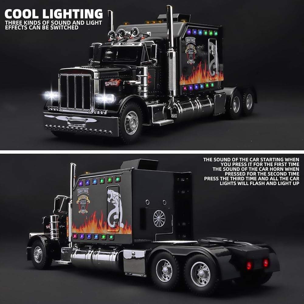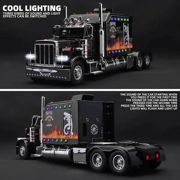 Descoperă puterea și eleganța clasică a șoselelor americane cu această machetă metalică TIR Peterbilt, un model de o complexitate rară, finisat într-o nuanță de negru sobru și impunător. Cu o lungime de 24 cm, această replică fidelă a celebrului camion american este concepută pentru a impresiona atât prin estetica sa exterioară, cât și prin funcțiile interactive care transformă o simplă machetă într-o experiență completă de joc. Fabricată din metal durabil, această piesă este construită să reziste testului timpului, fiind în egală măsură o jucărie robustă pentru copii și un obiect de expunere valoros pentru colecționarii pasionați de vehicule de mare tonaj.