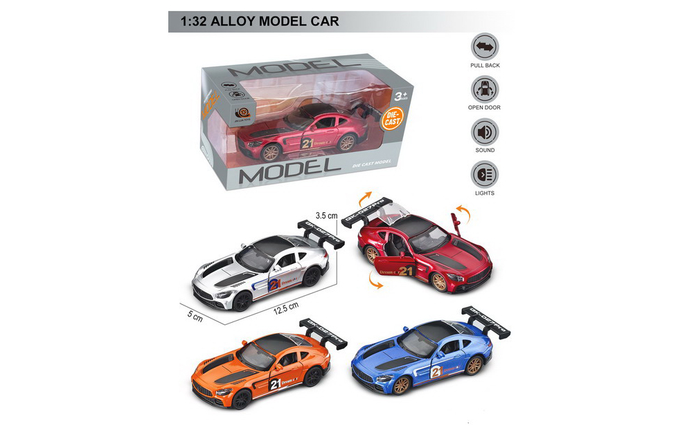Machetă auto din metal la scară 1:32 (aprox. 15 cm), dotată cu sunete de motor, faruri luminoase și uși care se deschid. Dispune de mecanism de retragere (pull-back) și o construcție durabilă din metal turnat. O jucărie premium pentru copii și colecționari, disponibilă acum en-gros.