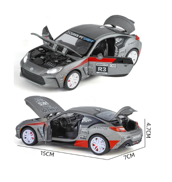 Mașina metal Toyota GR86 1:24 este potrivită pentru includerea în game de jucării en-gros, pachete promoționale sau oferte sezoniere. Datorită combinației dintre materialul metalic, dimensiunea generoasă și funcțiile interactive, produsul se adresează unei cereri constante din segmentul de mașinuțe pentru copii.