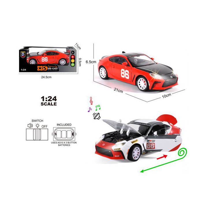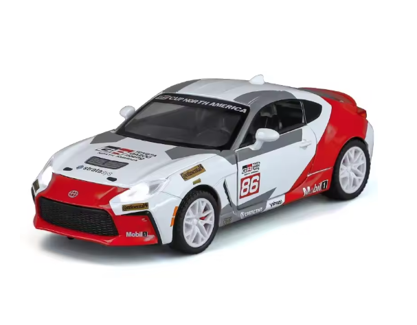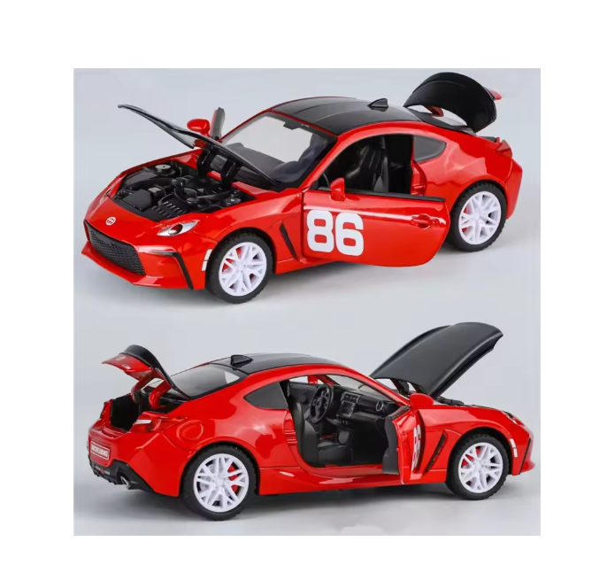 Mașina metal Toyota GR86 la scară 1:24 este un produs destinat comercializării en-gros, conceput pentru copii pasionați de mașini sport și pentru comercianții care doresc să ofere jucării atractive, cu aspect realist. Modelul reproduce o mașină sport cu design dinamic, finisaje atent realizate și detalii vizuale clare, fiind potrivit pentru magazine de jucării, distribuitori și importatori.