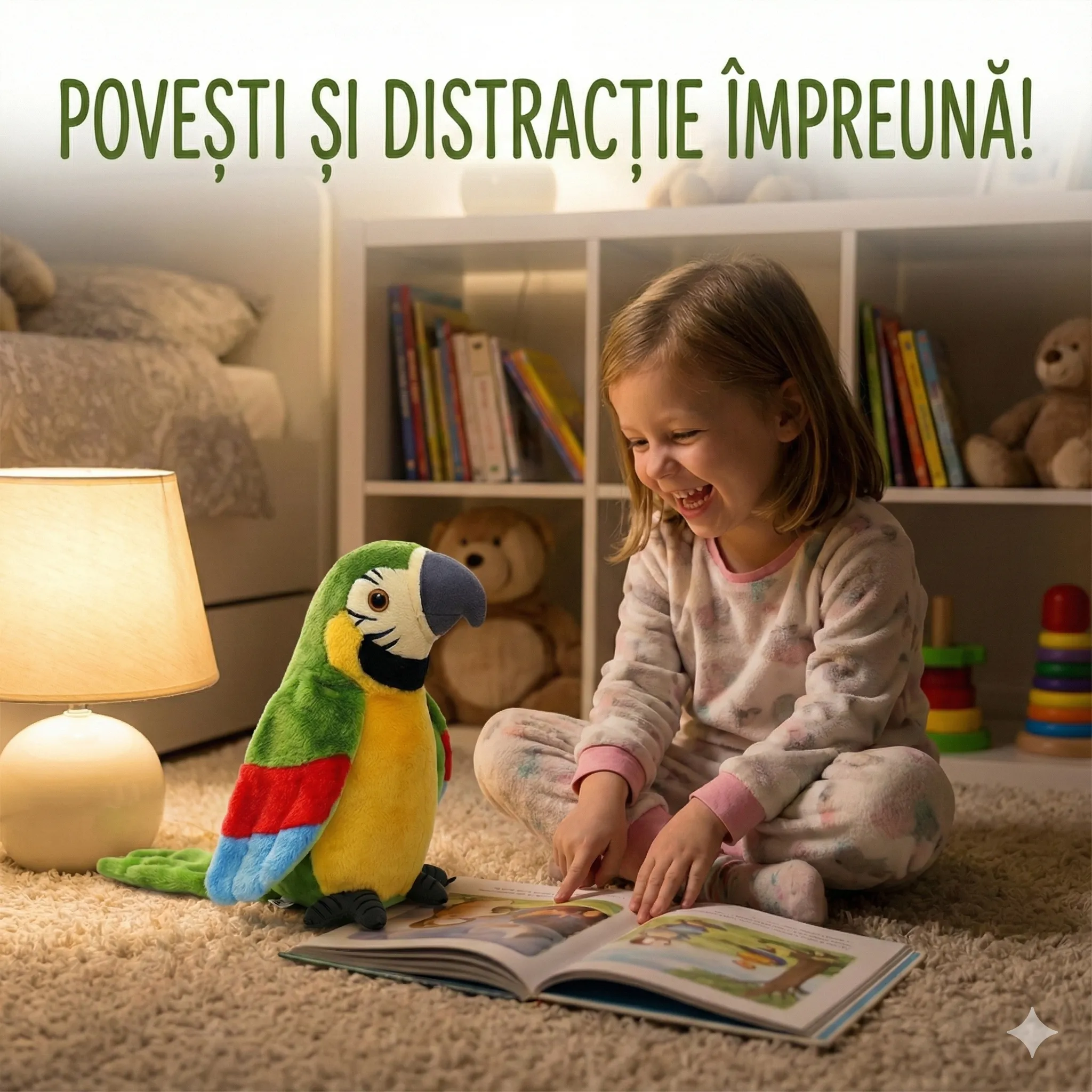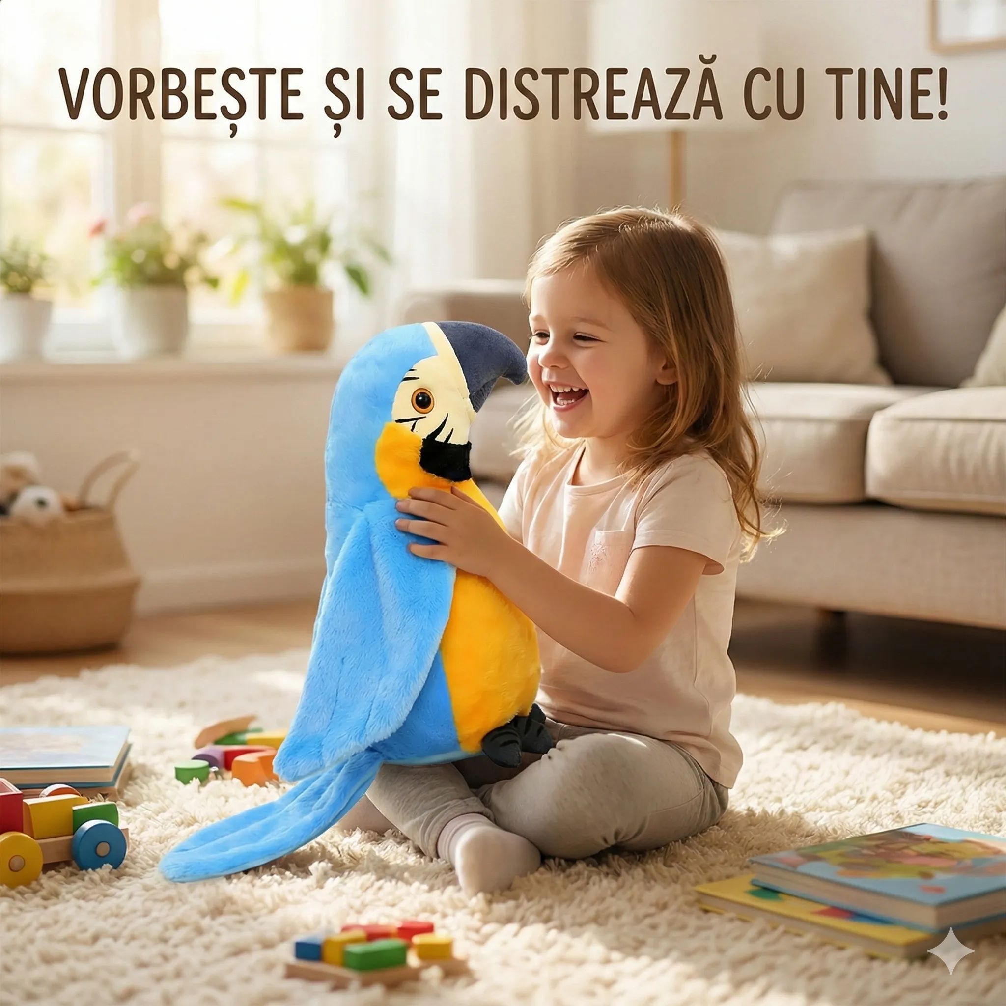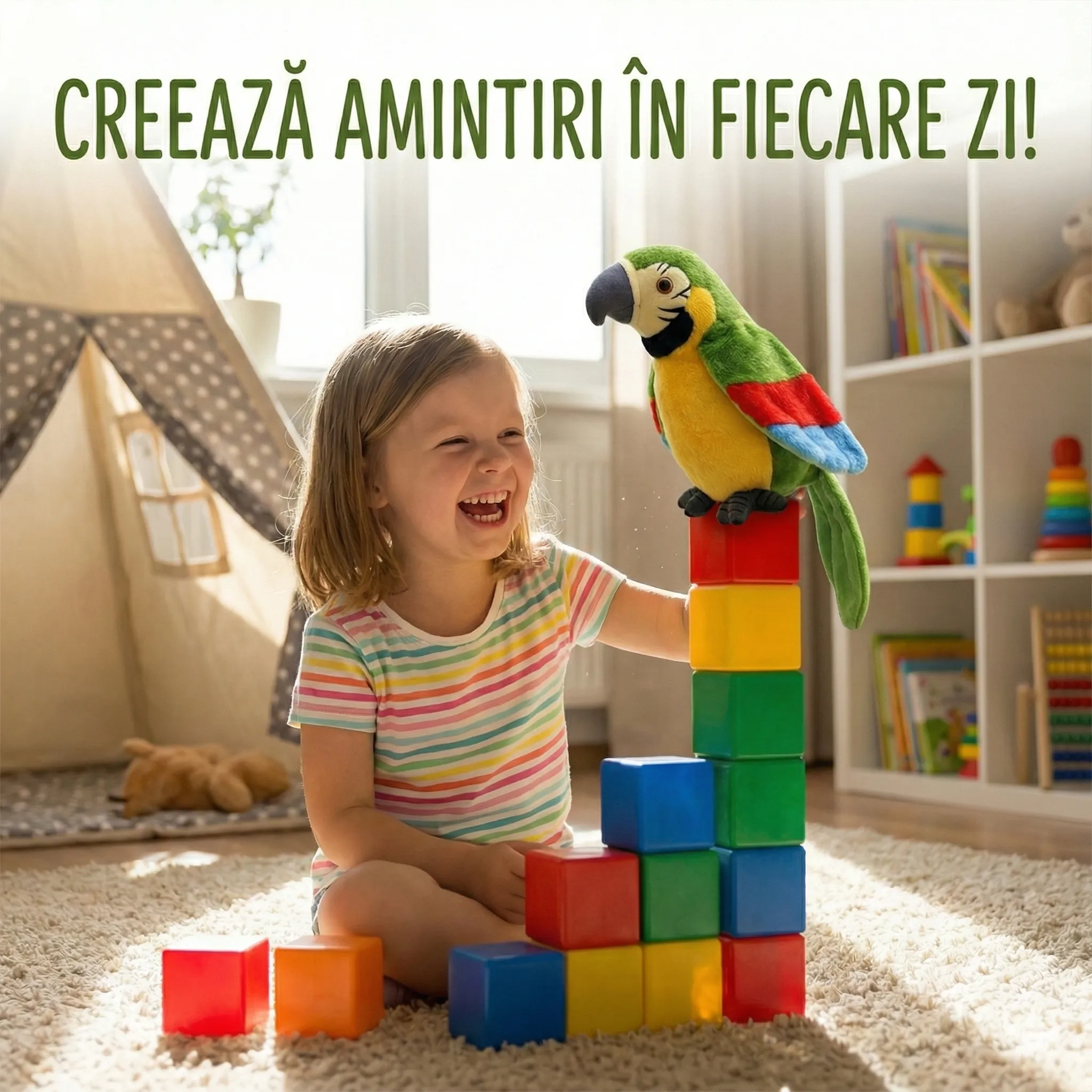 Versatilitate în Joacă: Datorită sistemului inteligent de prindere, papagalul poate fi așezat pe o suprafață plană sau agățat în camera copilului, devenind o piesă de decor veselă atunci când nu este folosit pentru joacă.