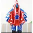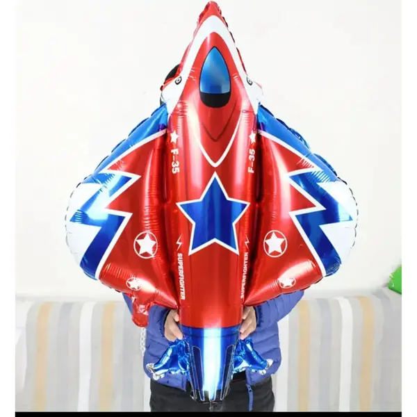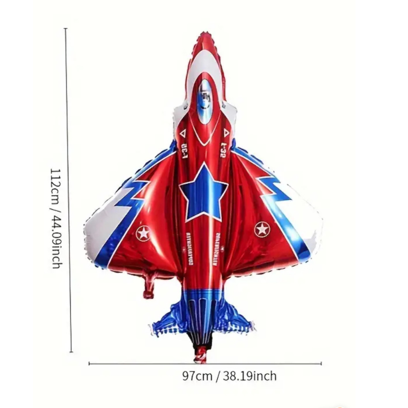 Designul, vizibil în imaginea de prezentare, redă silueta unui avion modern de culoare albă, decorat cu dungi albastre și accente roșii, oferind un aspect profesional și realist. Detaliile precum ferestrele cabinei, motoarele și aripioarele stabilizatoare sunt imprimate cu precizie pe folia de aluminiu de înaltă calitate, asigurând un finisaj metalizat strălucitor. Datorită formatului său masiv de 112 x 97 cm, acest balon domină vizual orice spațiu, fiind perfect pentru a fi suspendat de tavan pentru a simula zborul sau pentru a fi utilizat ca element central în arcadele de baloane de la intrarea în locație.