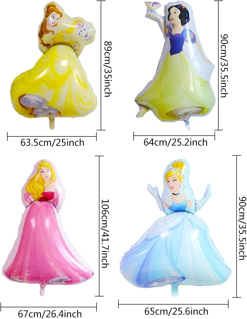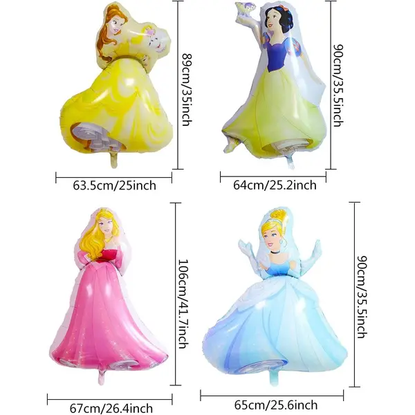 Designul, vizibil în galeria de imagini, surprinde personajele iconice precum Cenușăreasa, Albă ca Zăpada, Aurora și Belle, în ipostaze elegante, purtând rochiile lor celebre de bal. Detaliile grafice fine și culorile pastelate vibrante sunt imprimate pe o suprafață metalizată de înaltă calitate, oferind un luciu spectaculos care va încânta orice mică prințesă. Datorită formatului său generos de 85 x 60 cm, acest balon figurină este perfect pentru a decora zona principală de fotografii (photo corner), pentru a fi plasat lângă candy bar sau pentru a fi oferit ca un cadou deosebit care va impresiona prin mărime și rafinament.