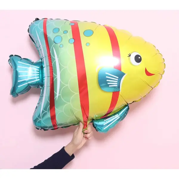 Analizând elementele vizuale, balonul impresionează prin culorile sale vii și detaliile grafice bine definite. Designul prezintă un pește exotic zâmbitor, cu ochi mari și expresivi, decorat cu dungi roșii verticale și aripioare albastre. Suprafața sa metalizată reflectă lumina, oferind un luciu spectaculos care imită strălucirea solzilor în apă. Formatul de 78 cm lungime asigură o vizibilitate excelentă, captând imediat atenția invitaților.