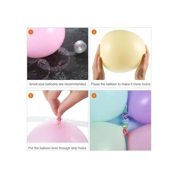 Lanțul bandă din silicon pentru arcadă baloane transparent este compatibil cu baloane de dimensiuni mici și medii, conform recomandărilor din imagini, și permite realizarea unor structuri curate, bine definite și stabile. Prin utilizarea acestui sistem, se reduce considerabil timpul de montaj și se obține un rezultat profesional, fără accesorii vizibile sau improvizații.