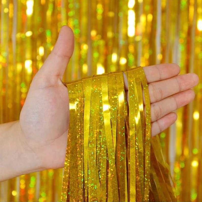 Realizată din folie decorativă strălucitoare, perdeaua creează un efect vizual deosebit prin reflexia luminii, transformând orice încăpere într-un spațiu festiv. Datorită suprafeței lucioase și a benzilor verticale, aceasta adaugă volum, dinamism și culoare decorului, fiind potrivită pentru petreceri aniversare, zile onomastice, evenimente tematice, petreceri private, recepții sau lansări de produse.