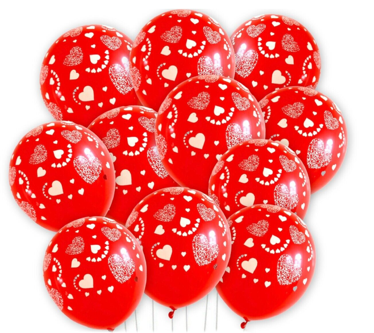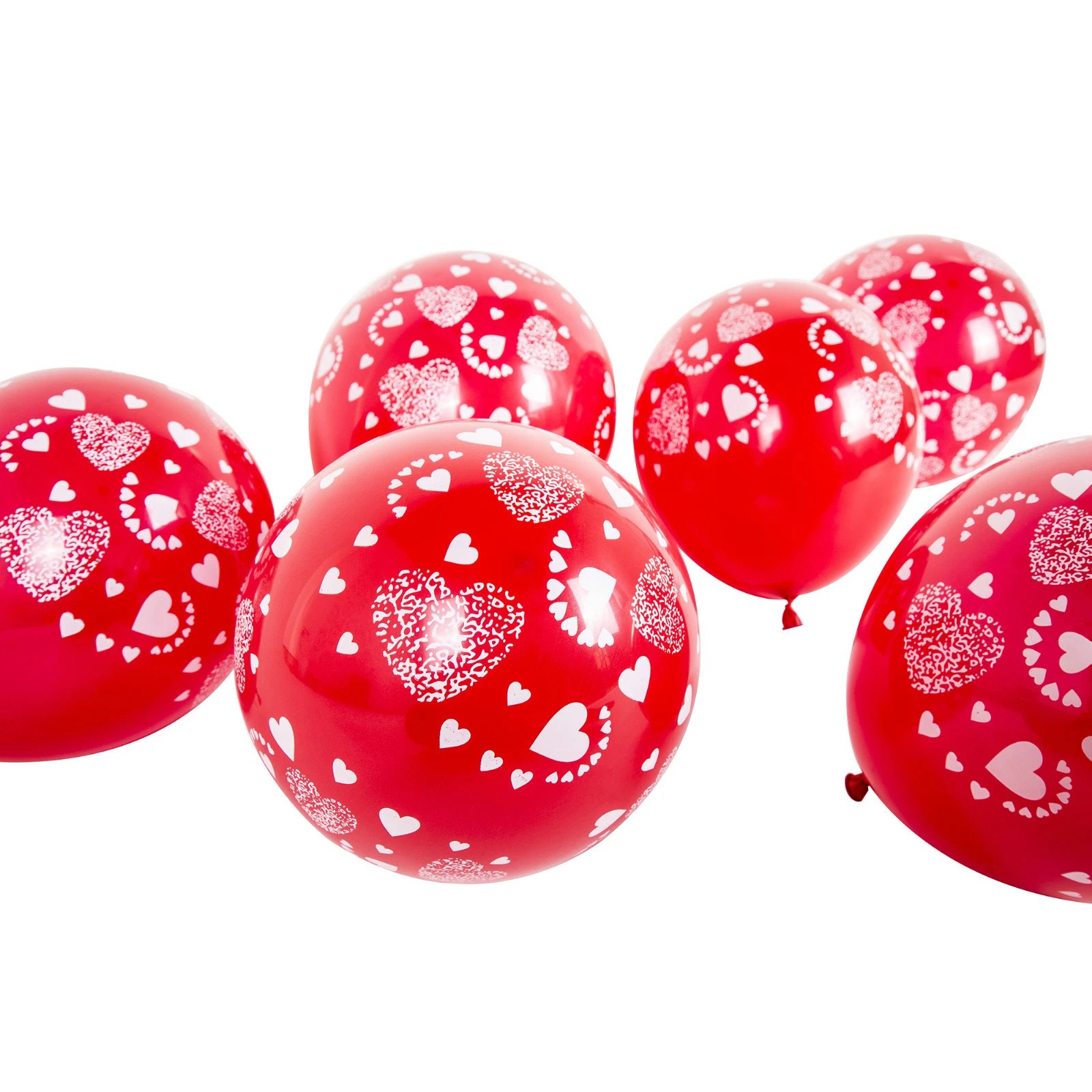 Latexul utilizat este flexibil și rezistent, permițând umflarea atât cu aer, cât și cu heliu, în funcție de necesitățile comerciantului sau ale clientului final. Baloanele pot fi utilizate individual, în buchete, arcade, panouri decorative sau mixuri cu alte modele și culori. Imprimeul cu inimioare este aplicat clar, fără zone estompate, așa cum se observă în imaginile produsului, iar contrastul alb-roșu rămâne vizibil și după umflare completă.