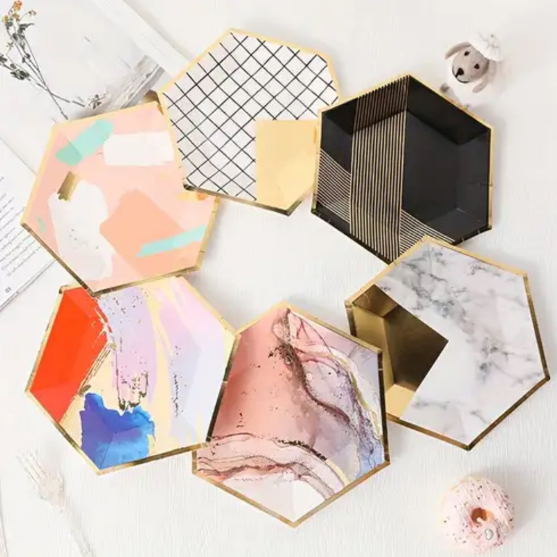 Designul hexagonal, vizibil în imaginile produsului, oferă un aspect contemporan și diferențiator față de farfuriile clasice rotunde. Fiecare farfurie este decorată cu modele elegante și variate, inspirate din stiluri moderne precum abstract, marmorat, geometric sau accente aurii. Această varietate de design face ca setul să fie extrem de versatil și ușor de integrat în diferite tipuri de petreceri aniversare, indiferent de tematică sau paletă cromatică.