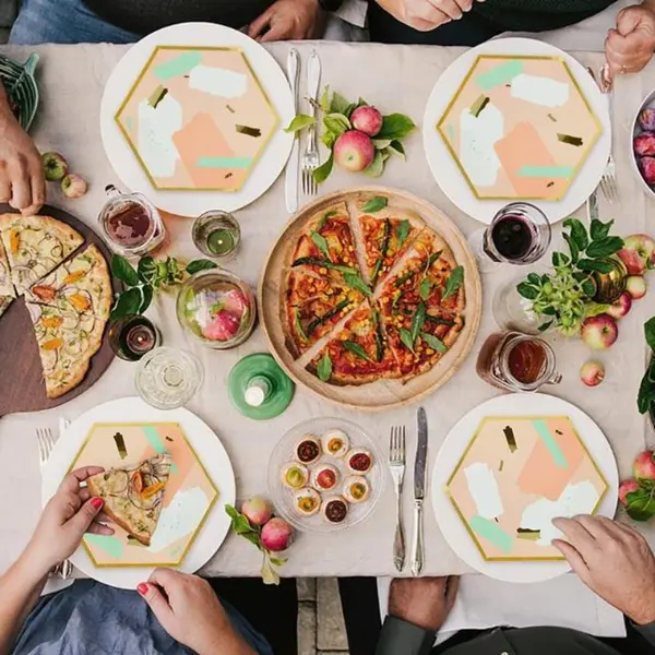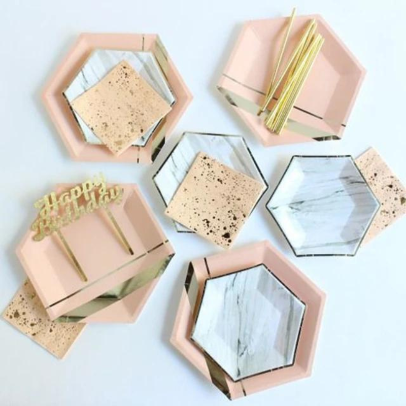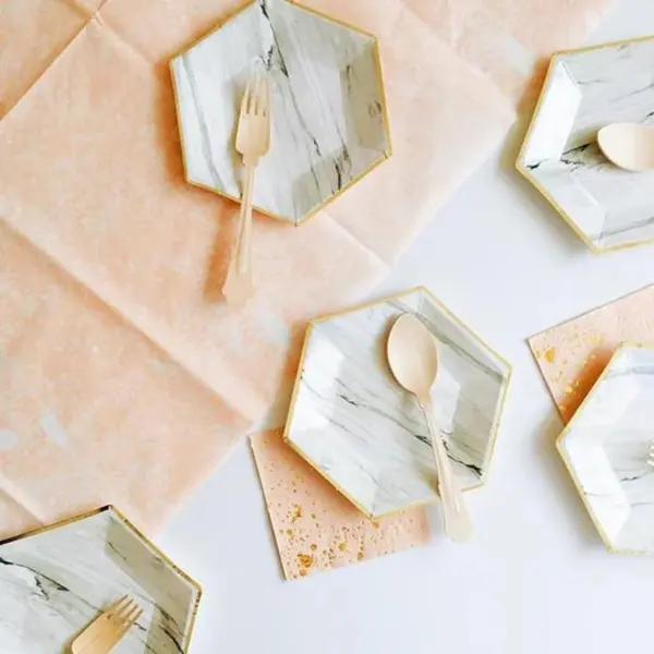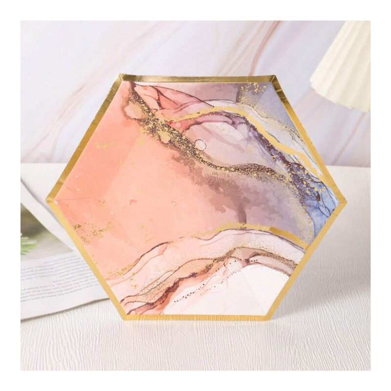 Designul hexagonal oferă un aspect modern și rafinat, diferit de farfuriile clasice rotunde. Forma geometrică bine definită, completată de marginea aurie vizibilă, transformă fiecare masă într-un decor atent pus la punct. Modelele imprimate sunt inspirate din texturi de marmură și accente artistice abstracte, în nuanțe pastelate, roz pudrat, alb marmorat, linii aurii și detalii grafice discrete, exact așa cum se observă în imaginile produsului.