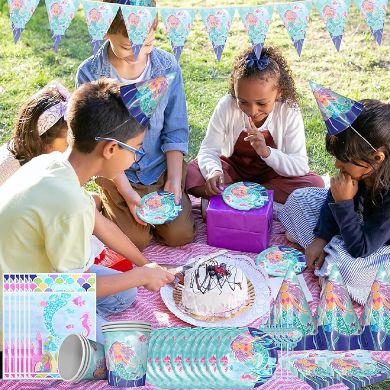 Setul este conceput pentru a deservi un grup mare de invitați și include farfurii de carton rezistent, pahare, tacâmuri complete și accesorii decorative care vor crea un cadru de poveste. Farfuriile au dimensiuni standard de 23 cm (pentru felul principal) și 18 cm (pentru desert), fiind ideale pentru orice tip de meniu festiv. Materialele folosite sunt de calitate alimentară, sigure pentru copii și prietenoase cu mediul, fiind ușor de colectat după eveniment. Cu acest set de 122 de piese, masa festivă și decorul camerei vor arăta impecabil, oferindu-le celor mici o experiență de neuitat în lumea sirenelor.